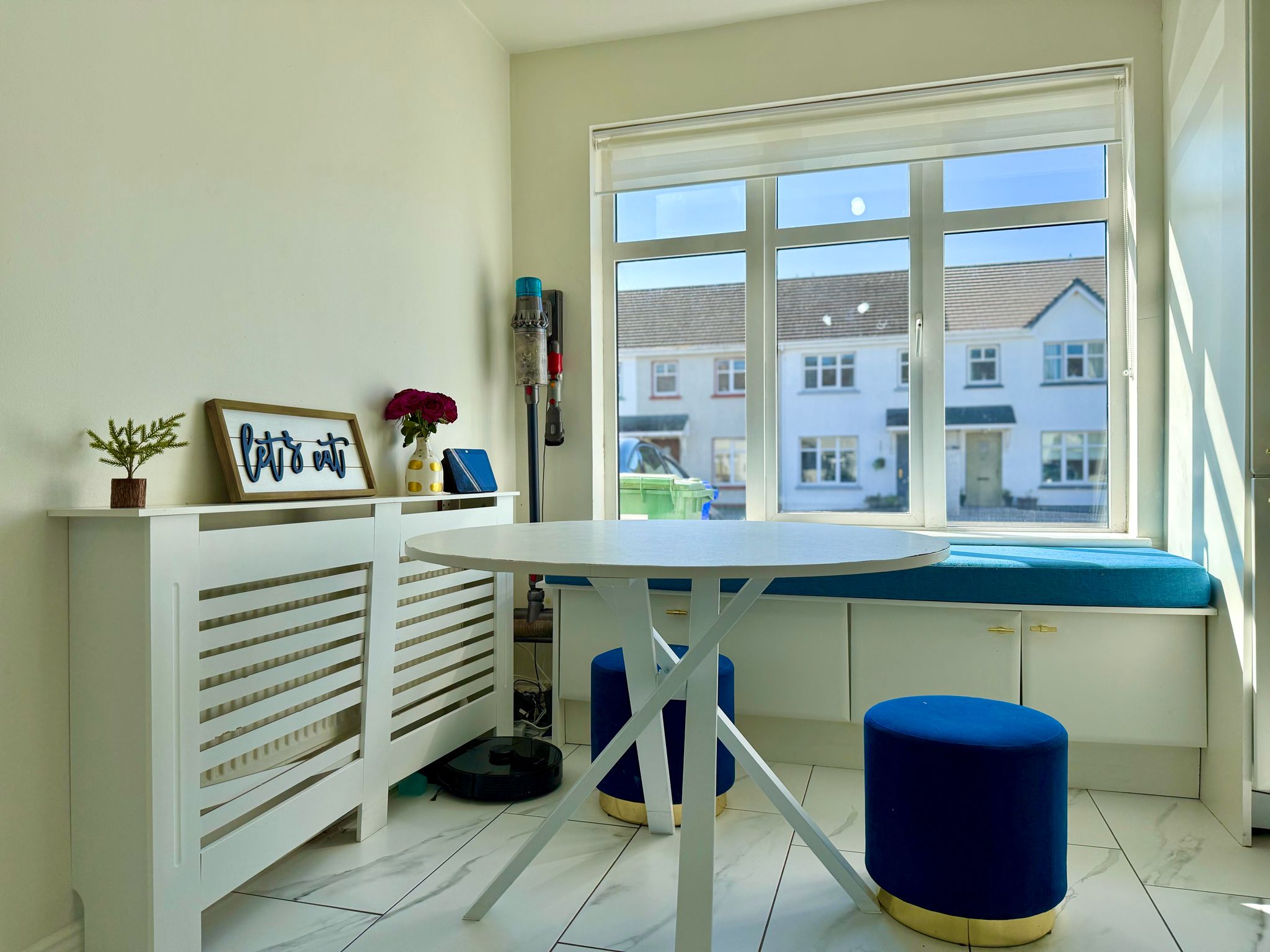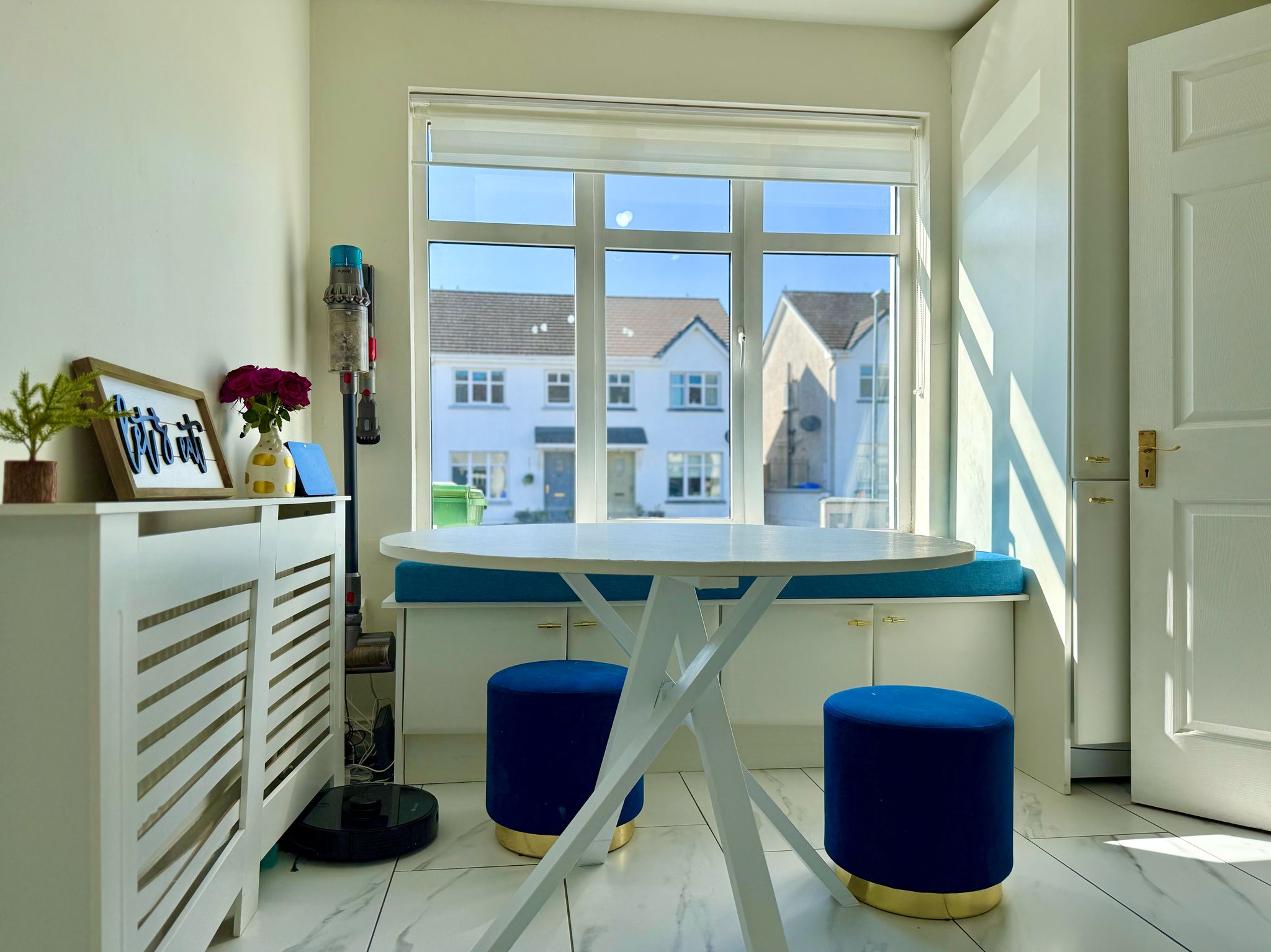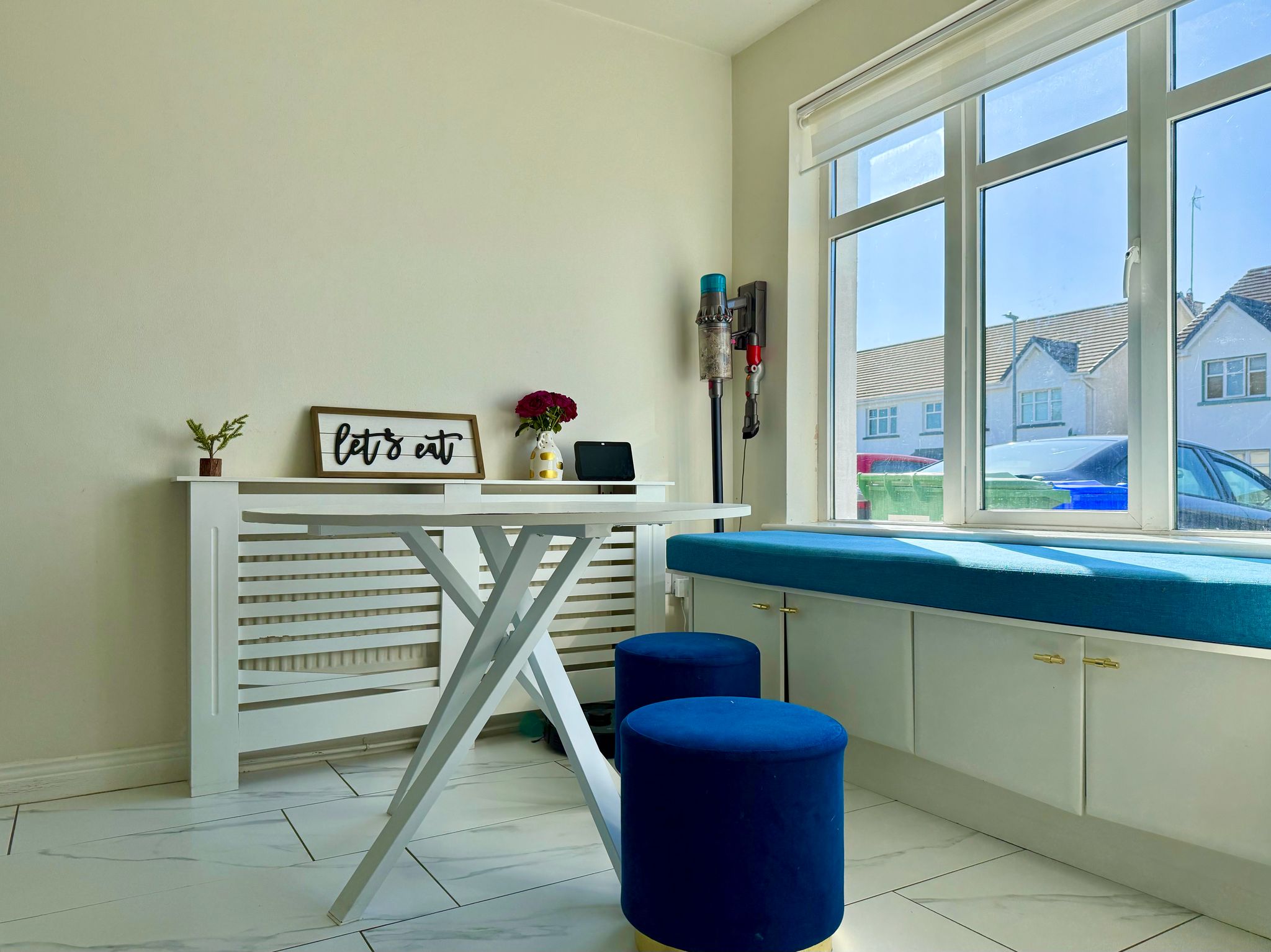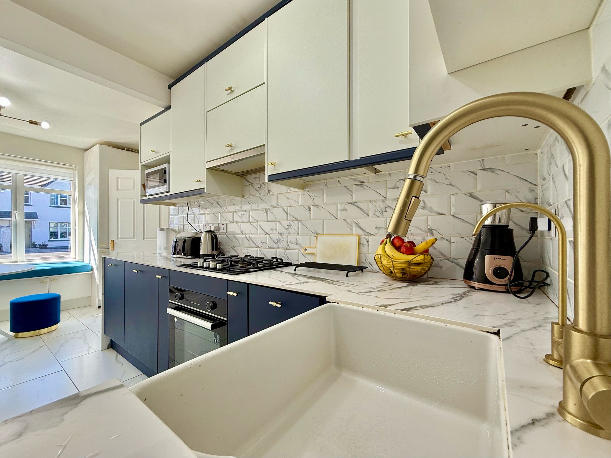 Just off the hallway are doors leading to the kitchen/dining area and living areas. The kitchen has been fully renovated with new cabinets and tiling, integrated appliances which include a fridge, freezer, dishwasher, and dustbins, Belfast sink with water softener system. Under-cabinet lighting installed, kitchen bay window added for extra light and style, new sit-out sofa nook in the kitchen area, new utility cabinets for washing machine and dryer.