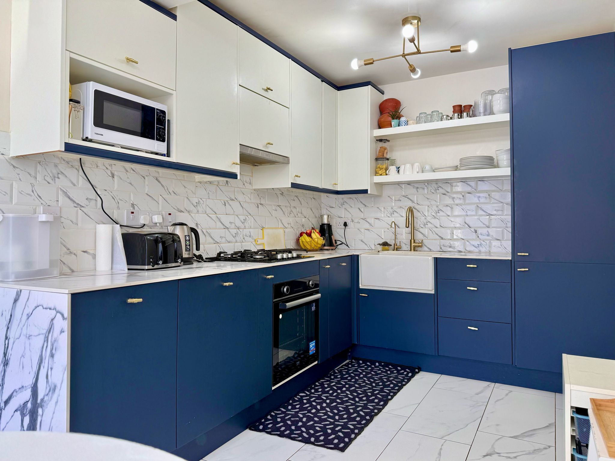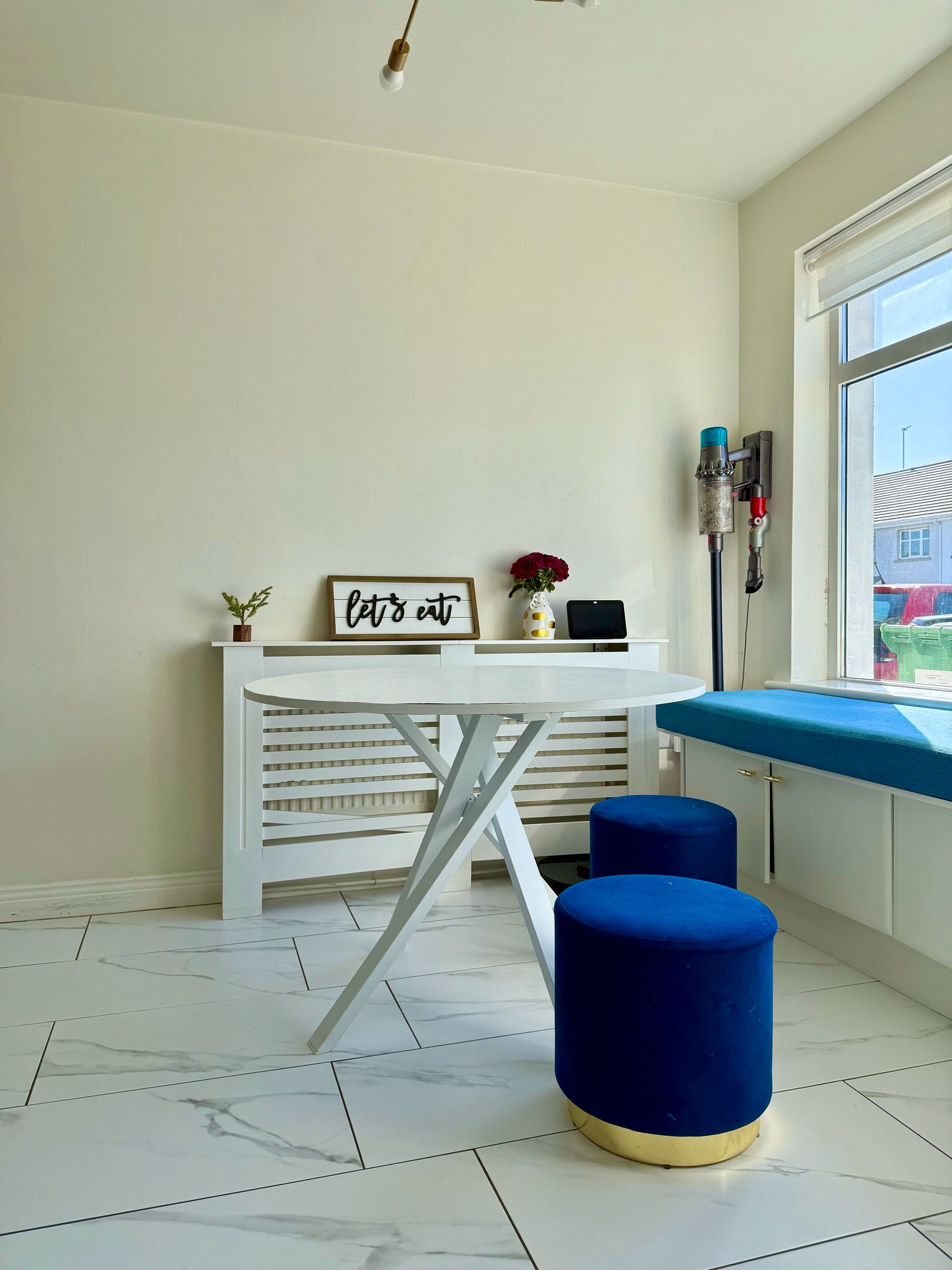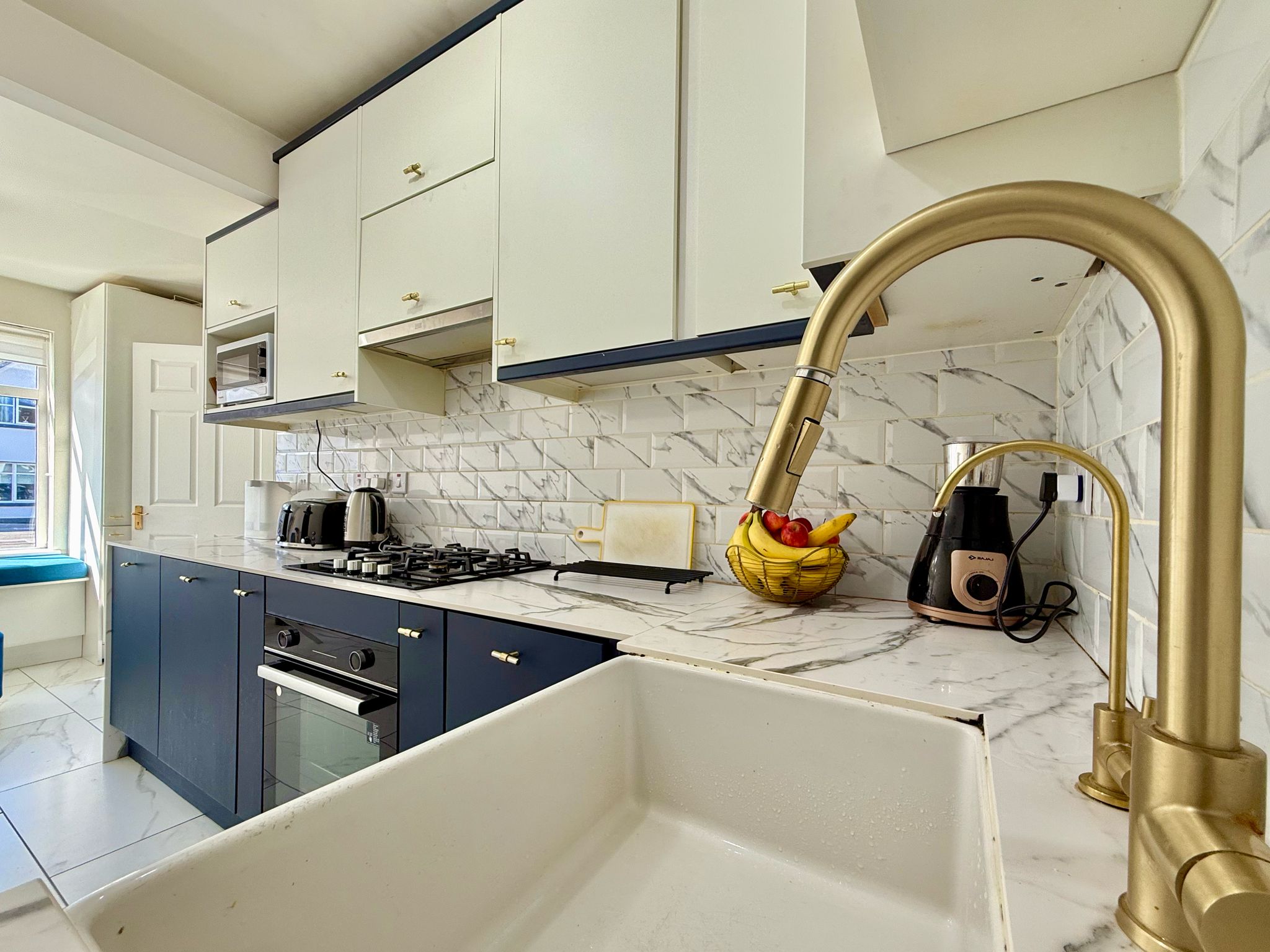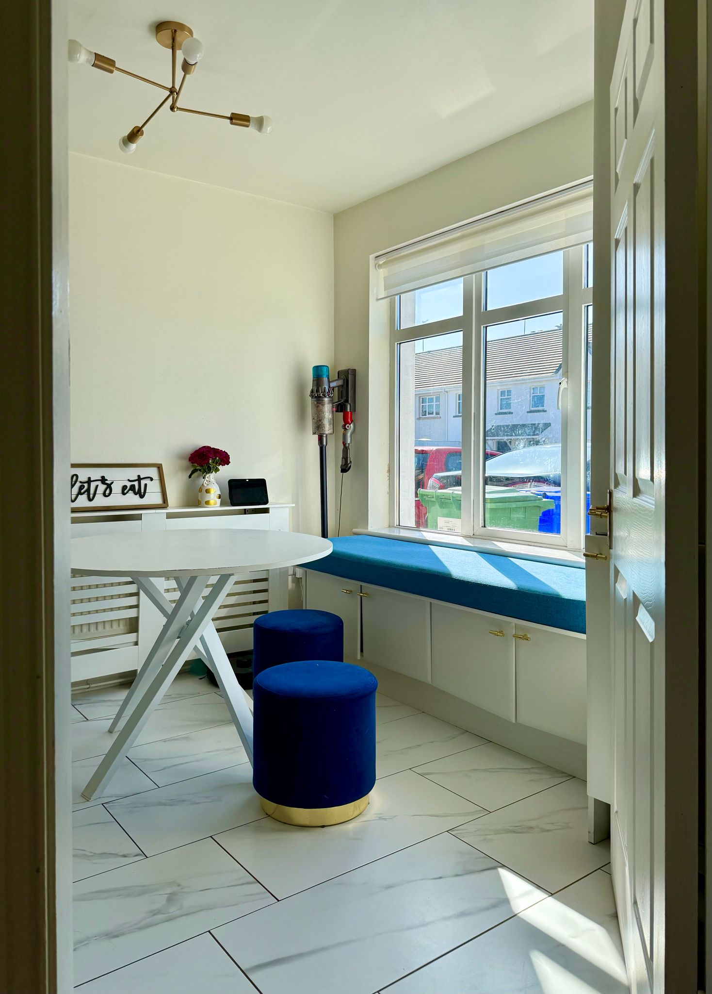 Just off the hallway are doors leading to the kitchen/dining area and living areas. The kitchen has been fully renovated with new cabinets and tiling, integrated appliances which include a fridge, freezer, dishwasher, and dustbins, Belfast sink with water softener system. Under-cabinet lighting installed, kitchen bay window added for extra light and style, new sit-out sofa nook in the kitchen area, new utility cabinets for washing machine and dryer.