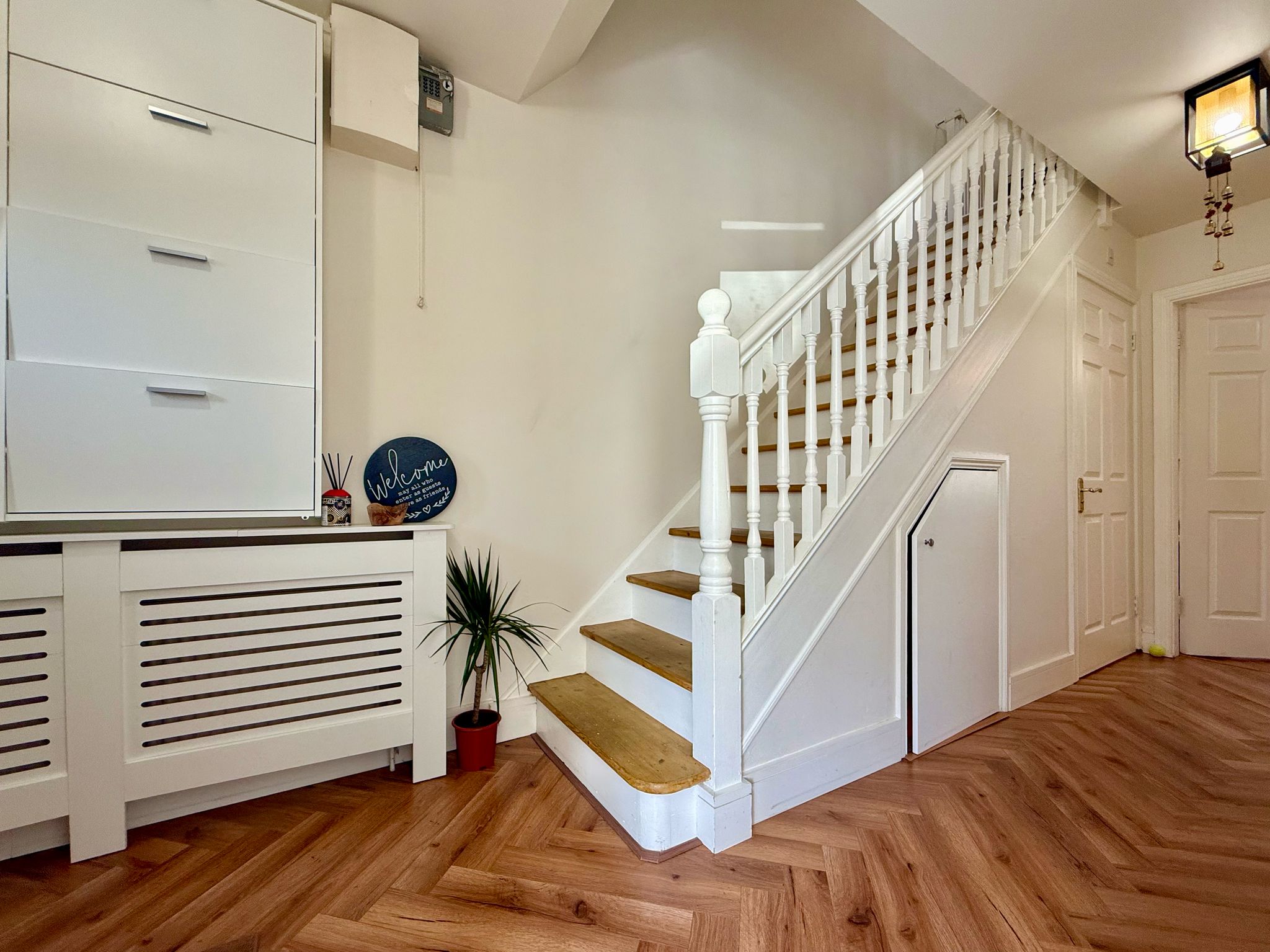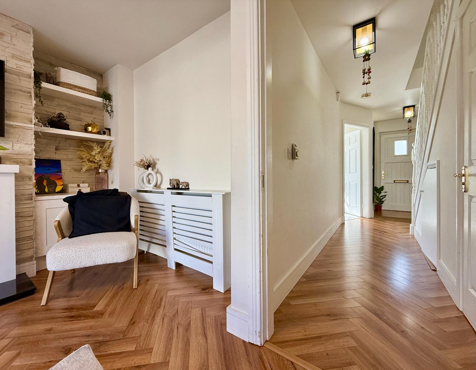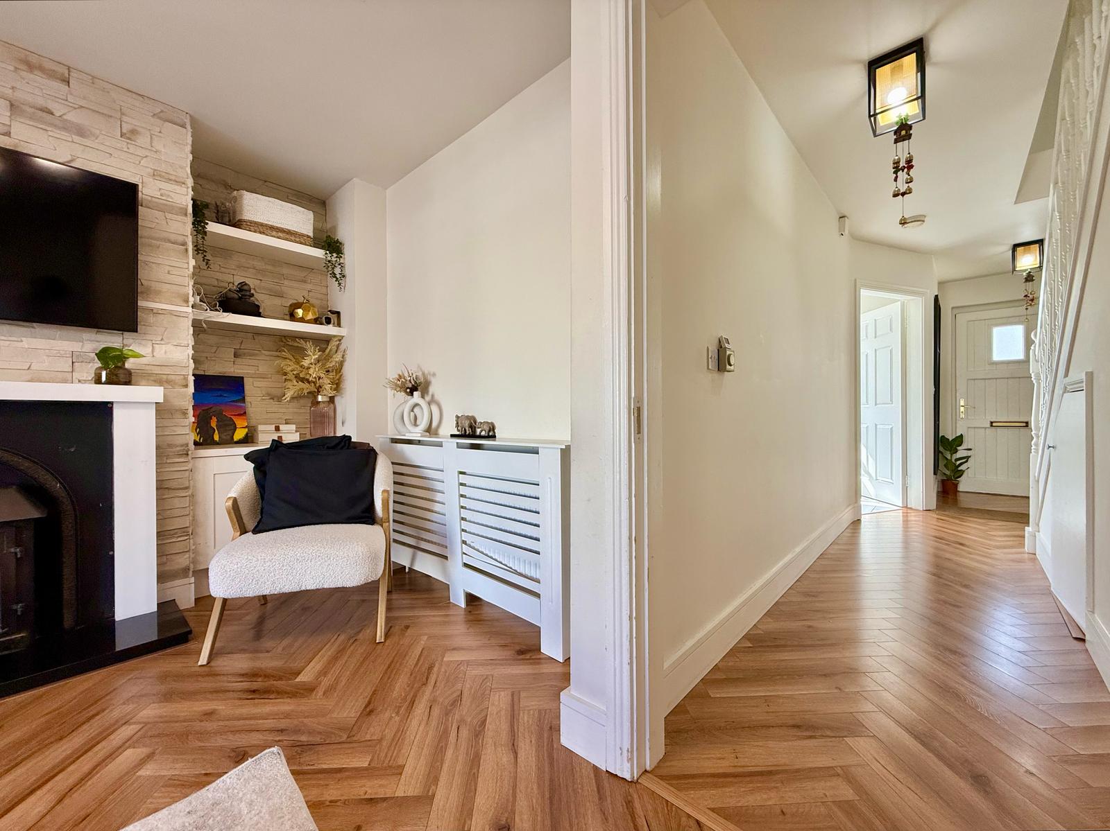 The current owners have meticulously updated this home and you can sense this from the moment you walk in through the front door. New herringbone flooring has been laid in the entrance hallway and living room and the house has recently been painted throughout. There is an enhanced under-stair storage unit for improved organization, incorporating a wall-mounted shoe rack.