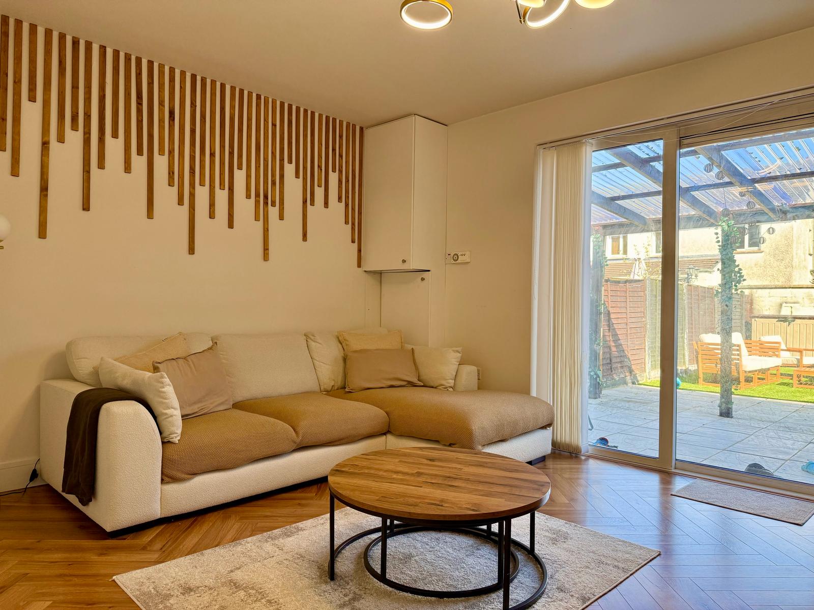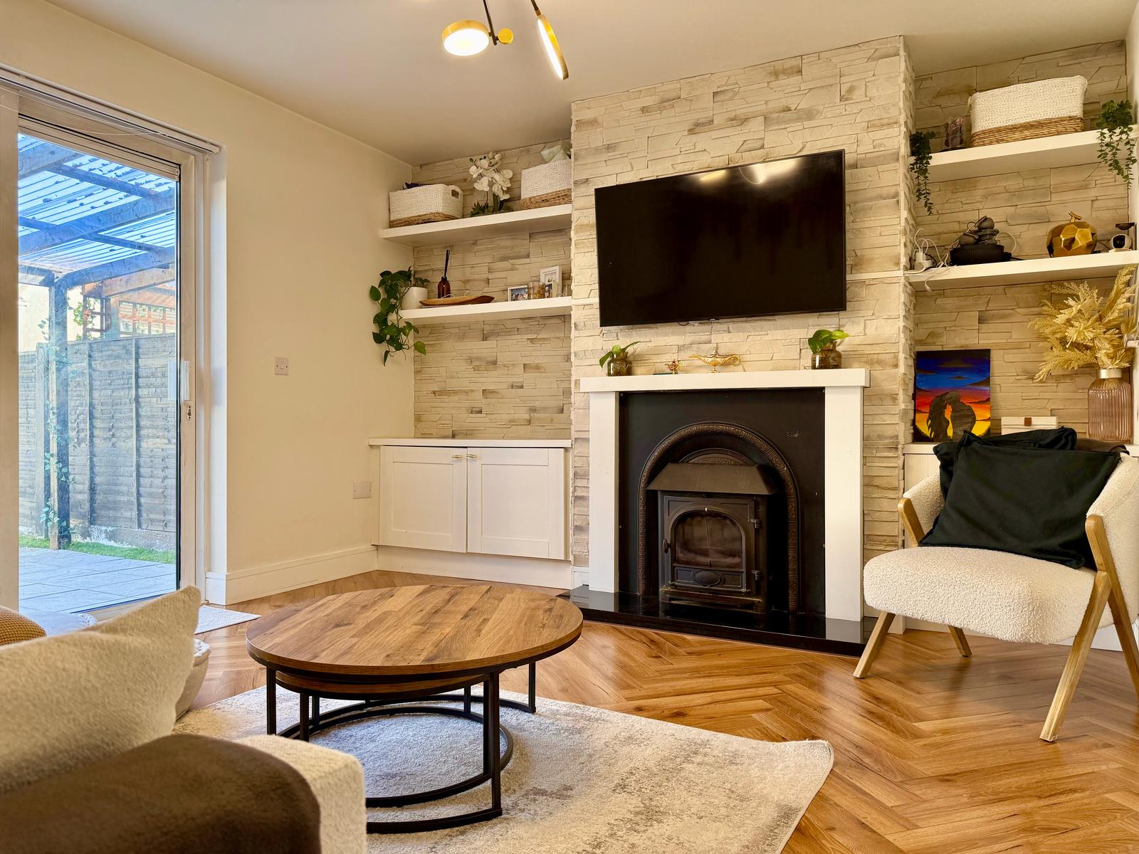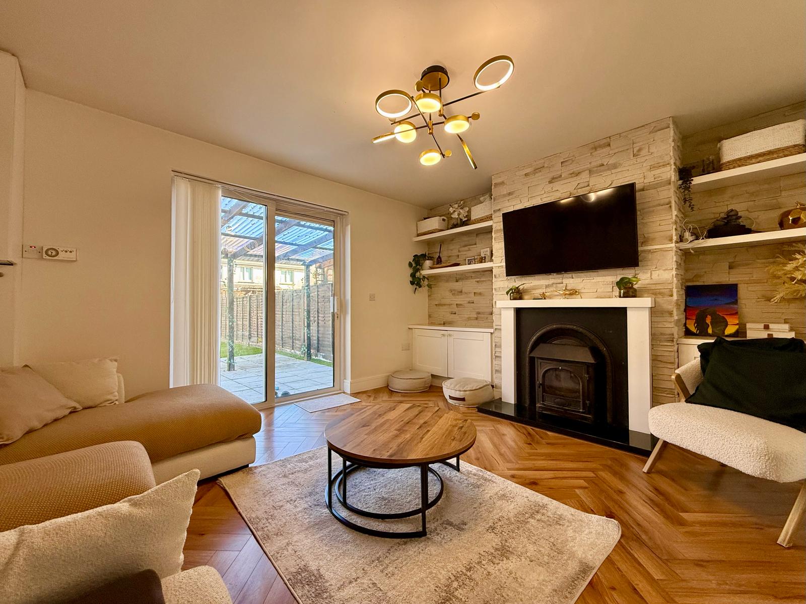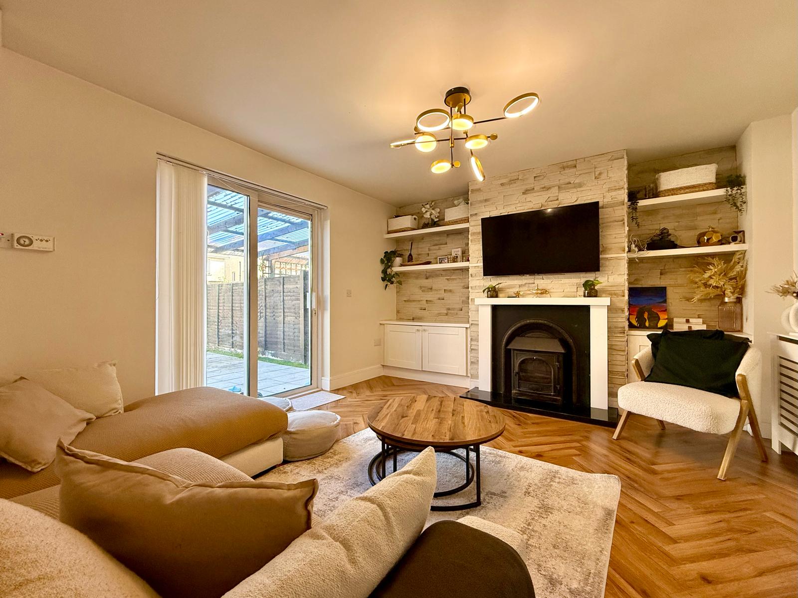 The sitting room area, which enhances cosy vibes including a wood burning stove, leads to double doors leading to a large landscaped and decked rear garden with artificial grass. Also on the ground floor is a downstairs WC/powder room which is fully renovated with a new basin.