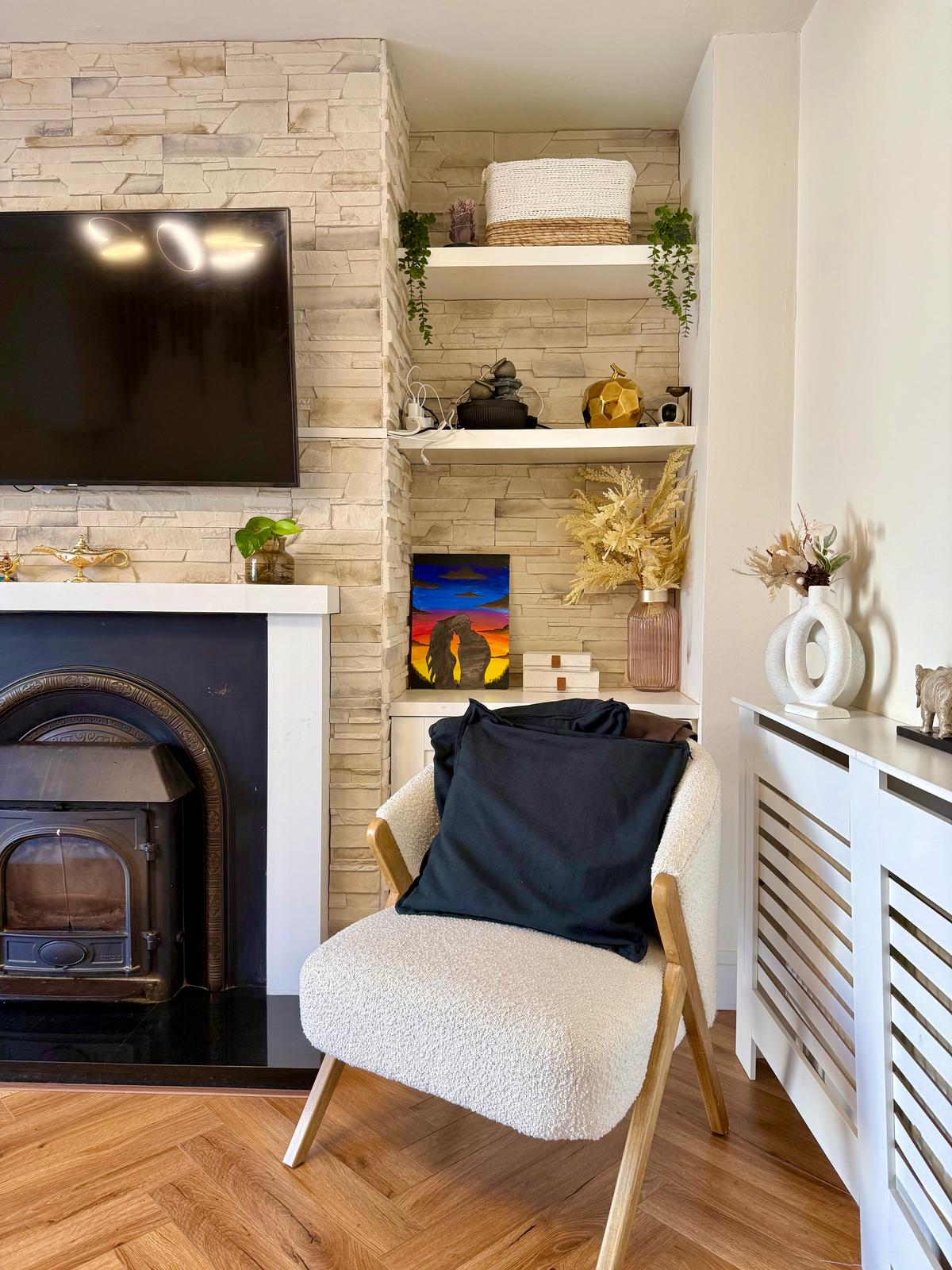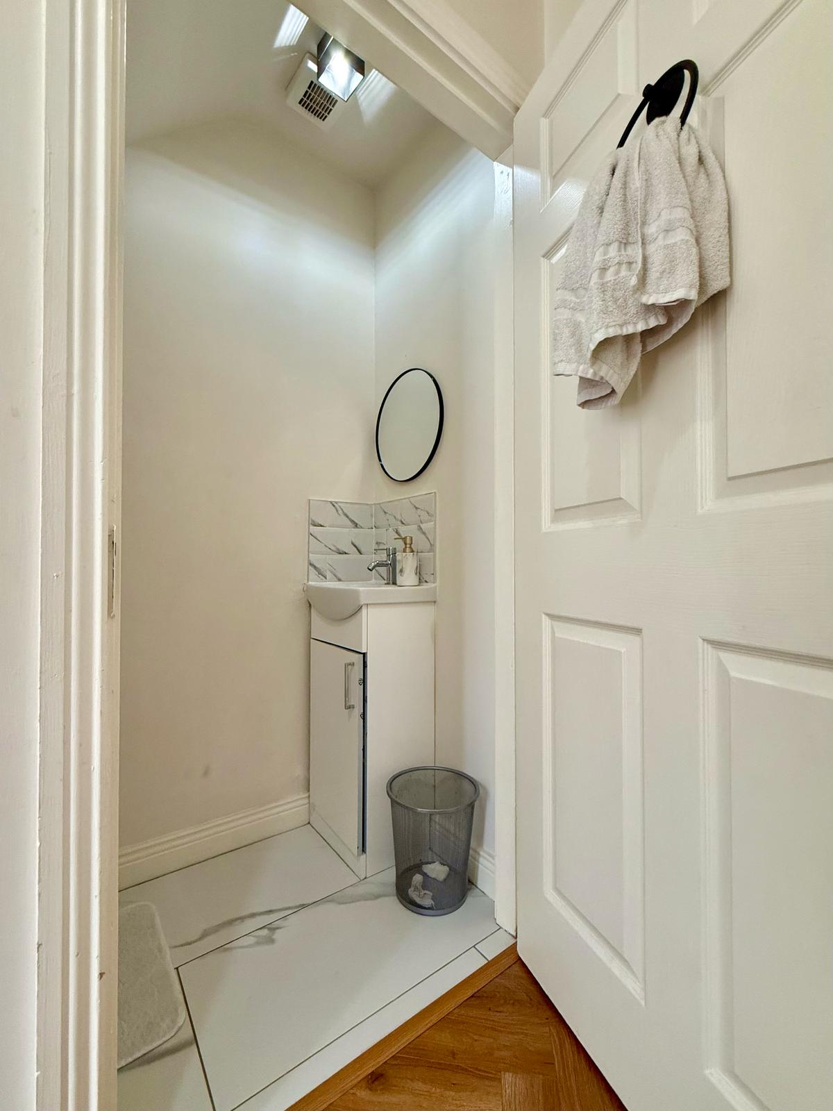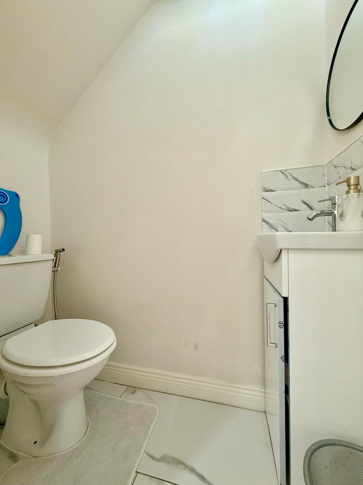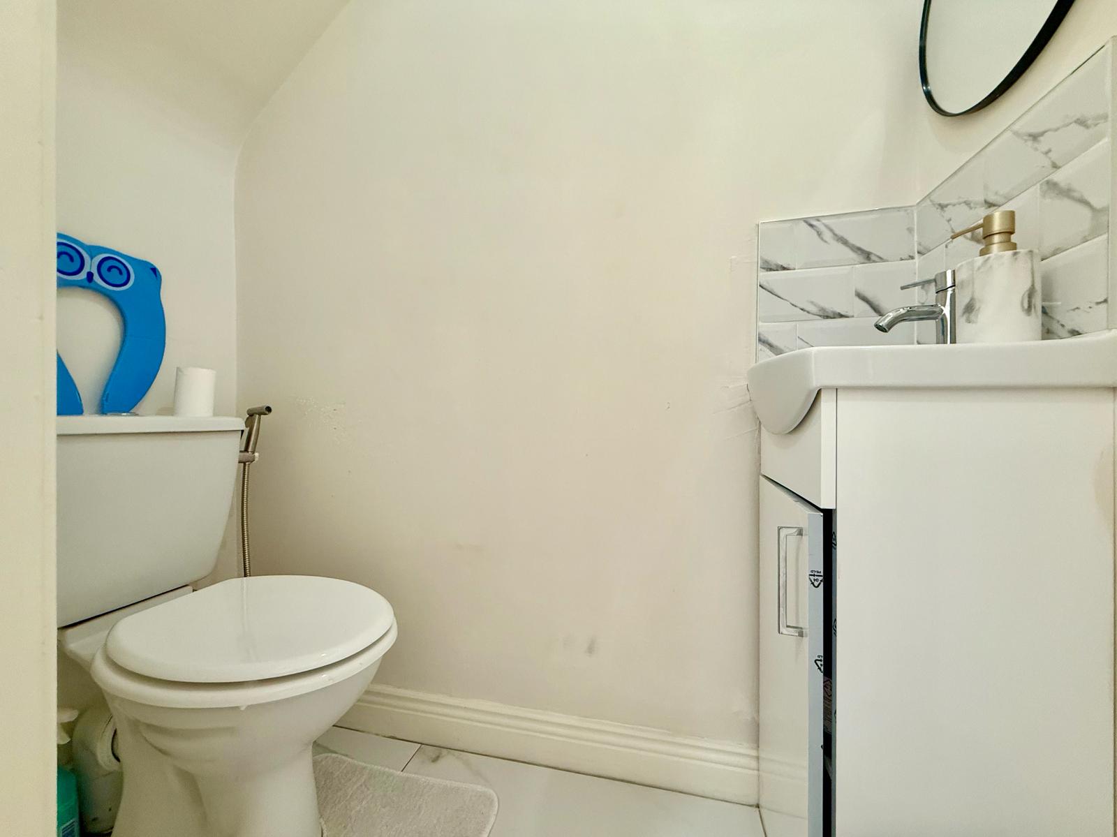 The sitting room area, which enhances cosy vibes including a wood burning stove, leads to double doors leading to a large landscaped and decked rear garden with artificial grass. Also on the ground floor is a downstairs WC/powder room which is fully renovated with a new basin.