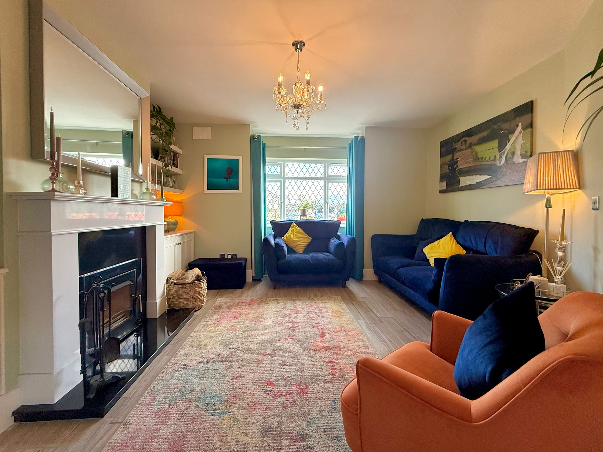 Upon entering, you’re greeted by a light-filled hallway with new wood-effect tiled flooring and carpeted stairs leading to the first floor. To the left lies a guest WC, complete with built-in storage — perfect for modern family living. The L-shaped kitchen/dining area forms the heart of the home — spacious and thoughtfully designed, featuring ample cabinetry, a built-in larder press, integrated appliances, and double doors opening out to the rear garden. The kitchen also connects through double doors to the cosy lounge, where a beautiful marble fireplace and custom-built cupboard create a warm and elegant focal point.