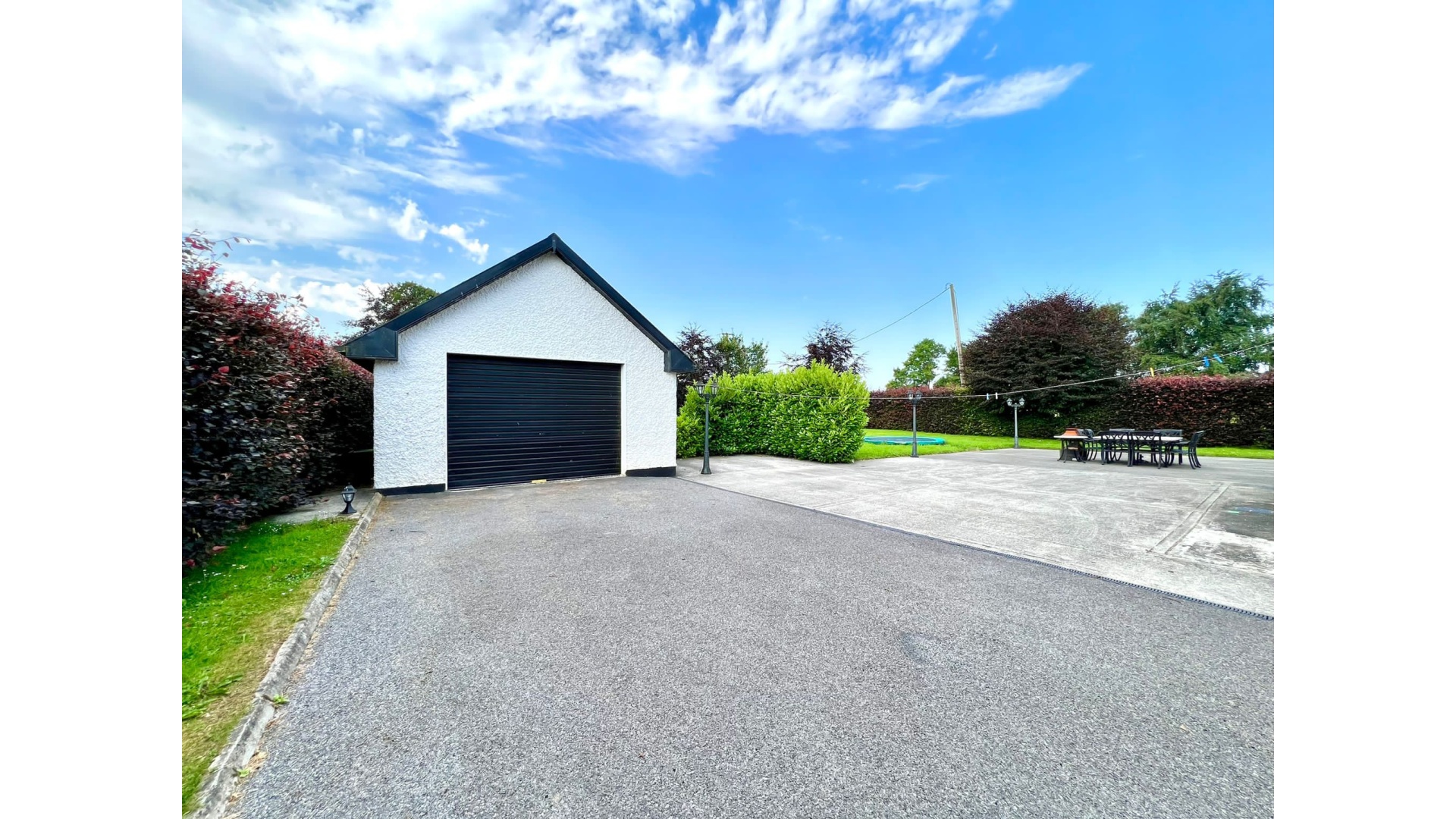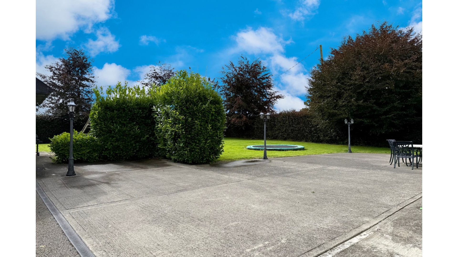 Externally, the property sits on beautifully landscaped gardens with mature hedging, front and rear lawn lighting, and an automated gated entrance with intercom system for security and convenience. A large garage with dry-lined interior, laminate flooring, and converted attic storage lies to the rear, offering endless possibilities. A generous concrete yard further enhances the outdoor space, while family-friendly features such as an in-ground trampoline add to the lifestyle appeal.