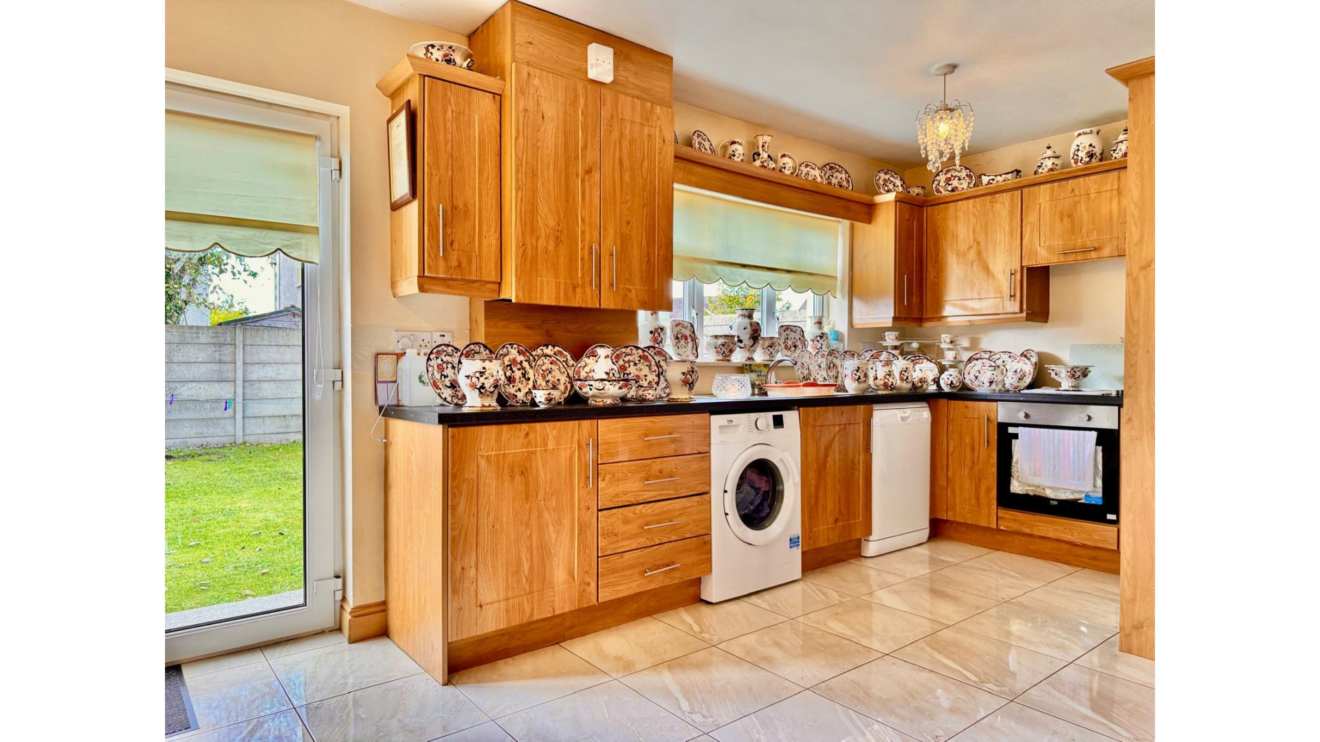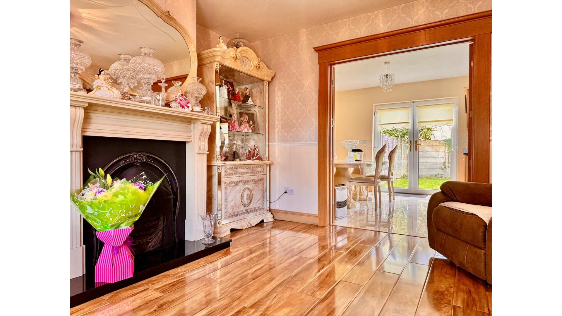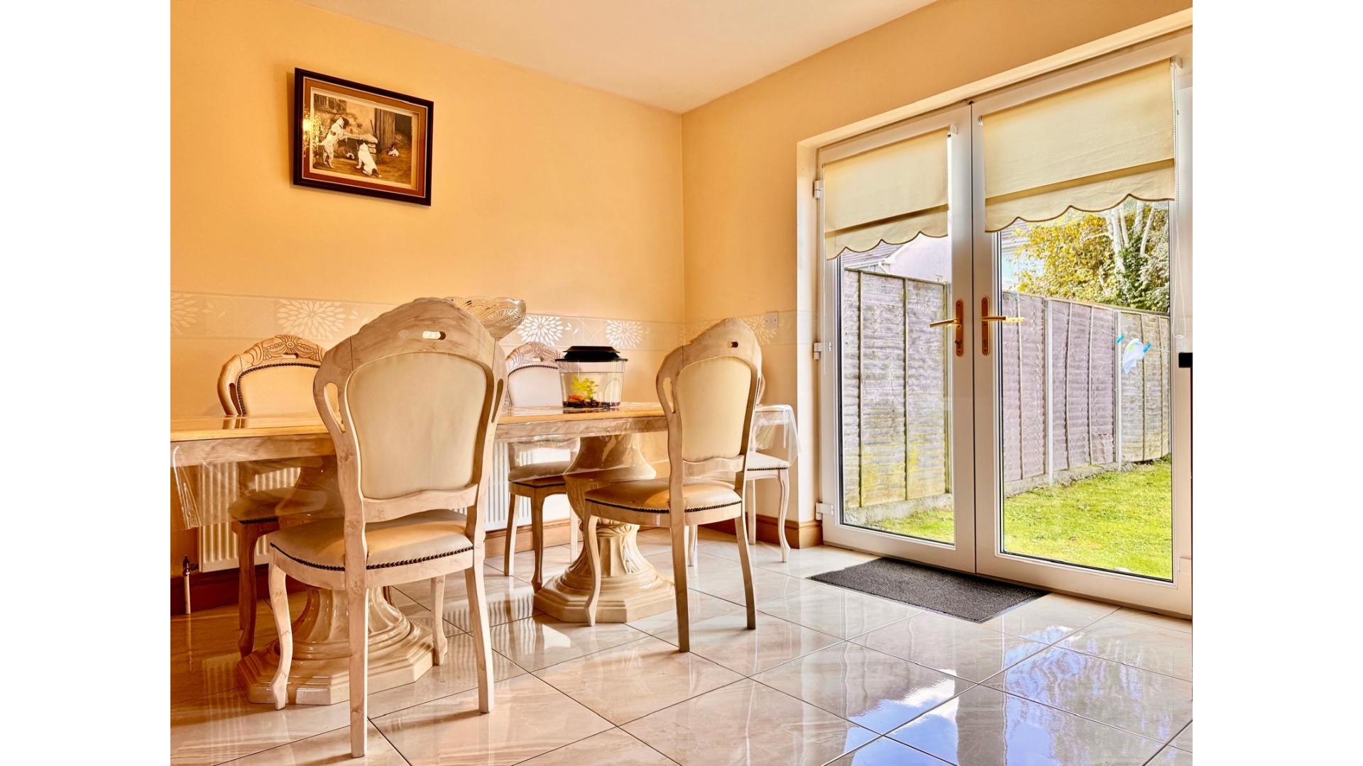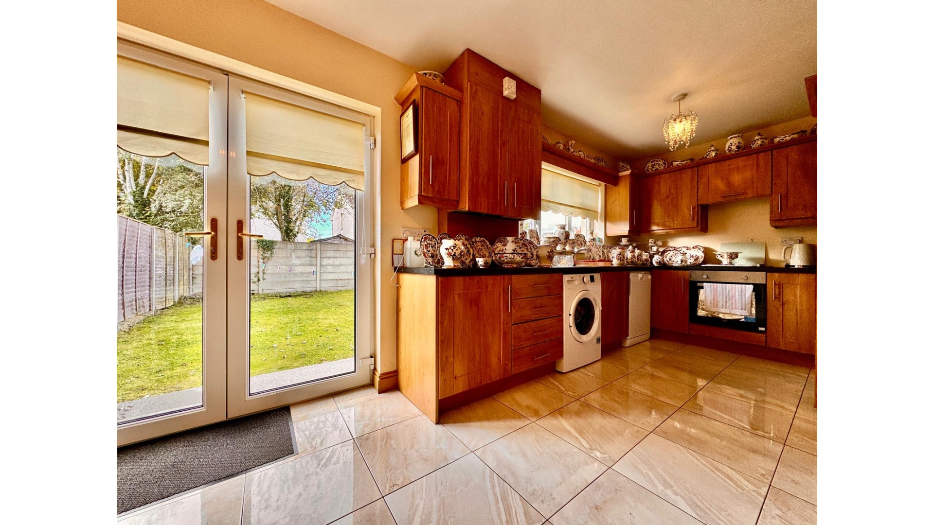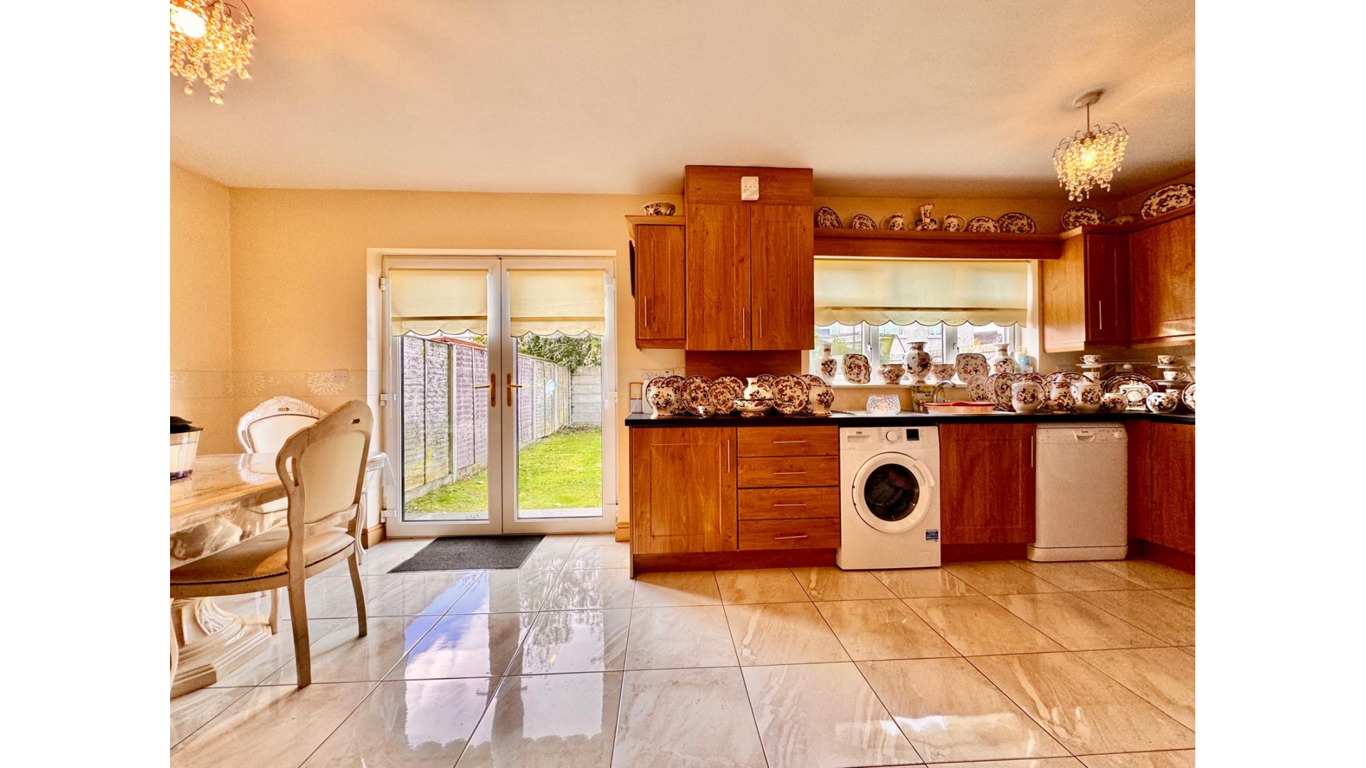 The house itself is approached via a tarmac driveway which comfortably provides private parking. What is evident from the moment you step into this home is that it is beautifully decorated throughout. A sense of flow pervades the layout of this light-filled two-storey home as one enters through the front door meeting a muted palette. Just off the hallway one will find a spacious living space with feature electric fire place. Double doors leads you through to a the kitchen, this area is filled with an abundance of natural light due to the French doors and wide kitchen window which lead the eye towards the patio area which is perfect for al fresco dining. A Guest WC completes the downstairs accommodation.