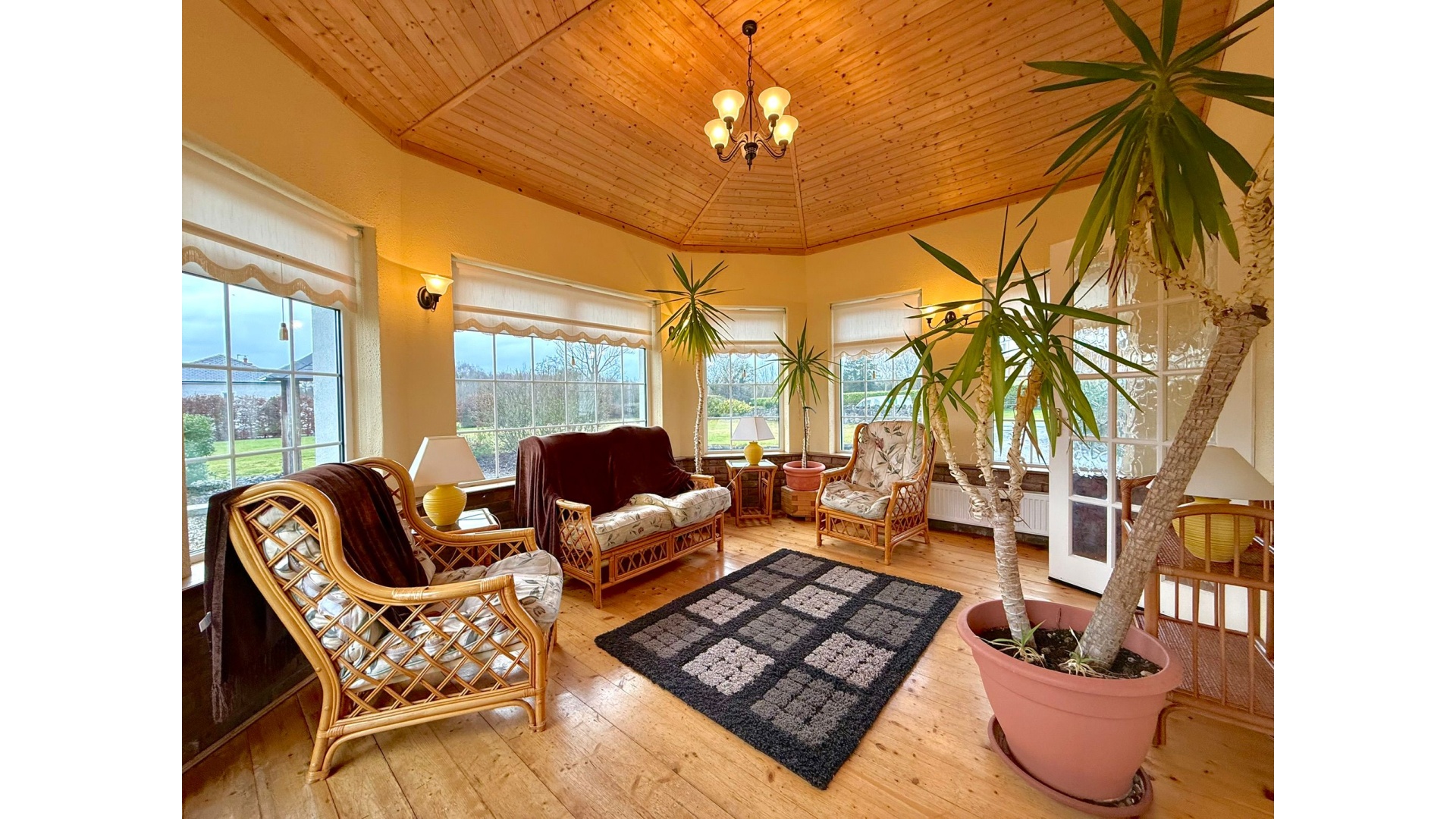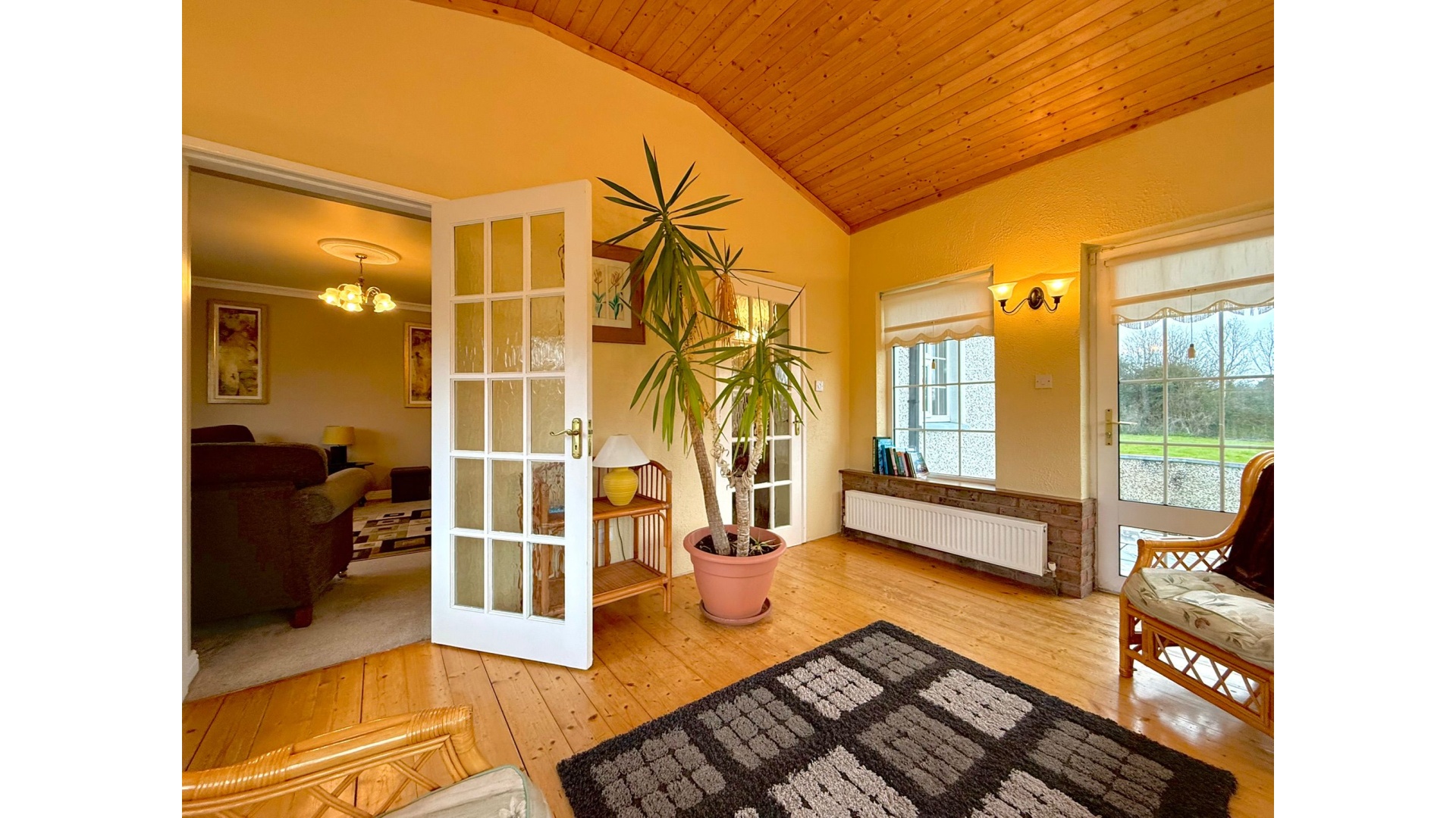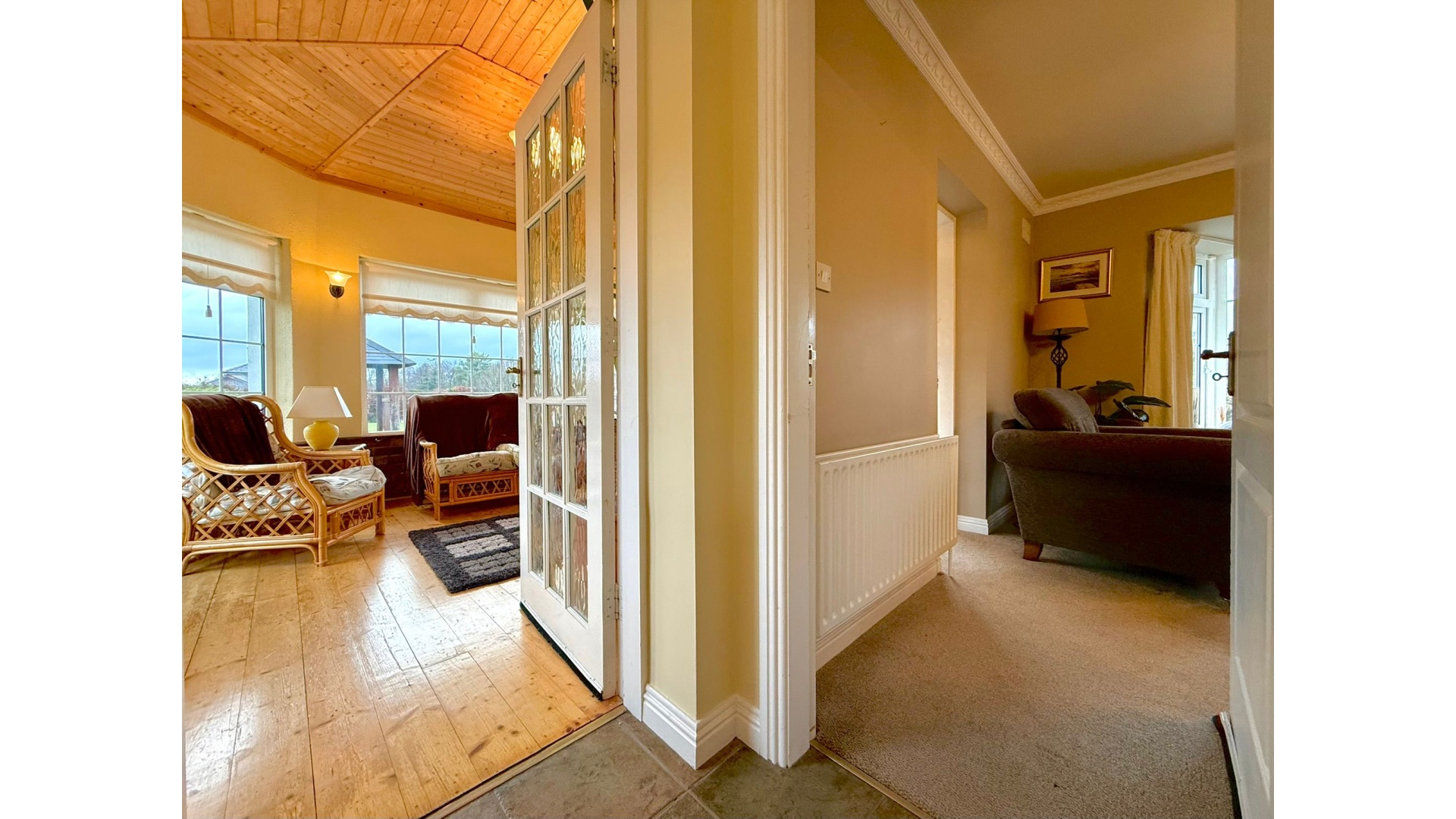 A bright conservatory extends from the main living space, flooding the home with natural light and offering a peaceful spot to relax while enjoying views of the surrounding gardens.