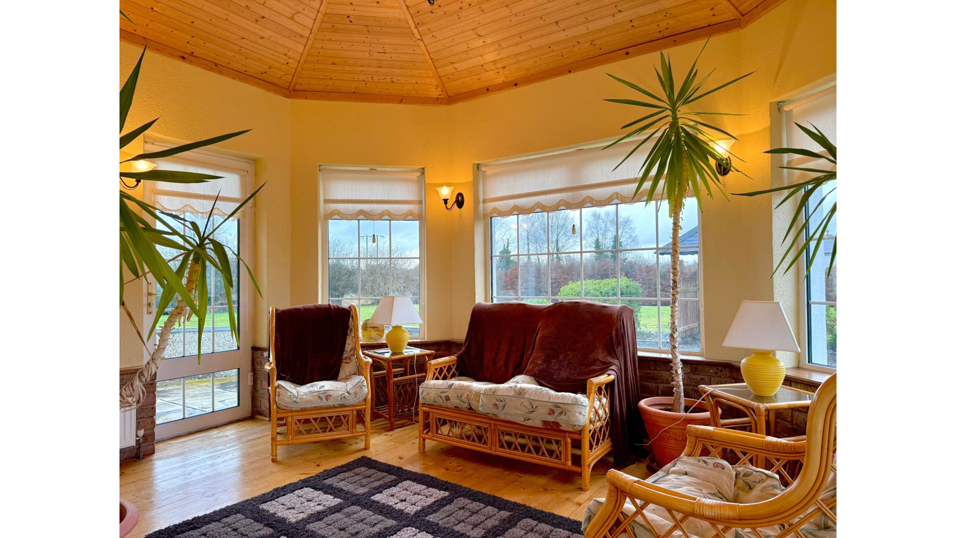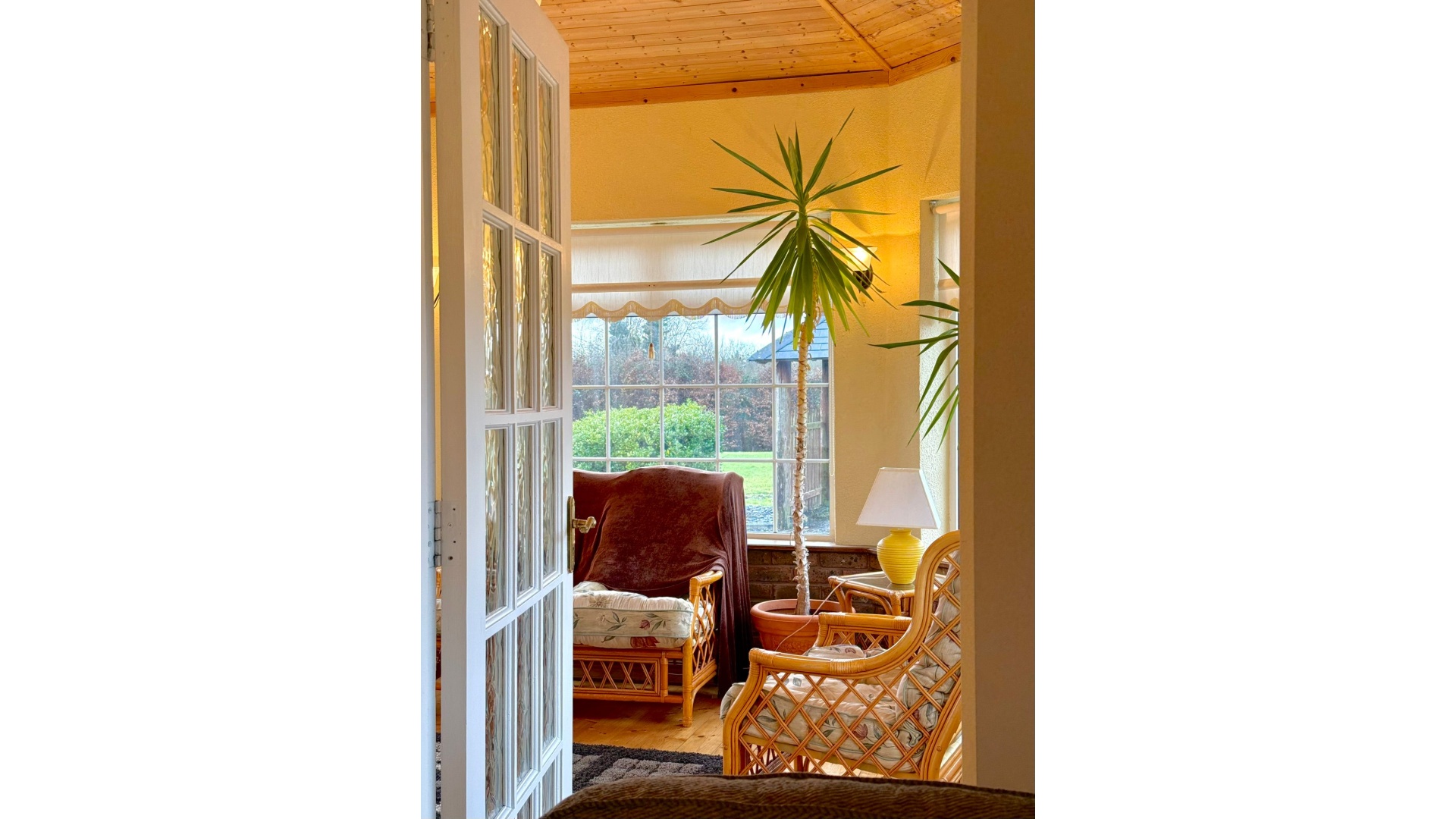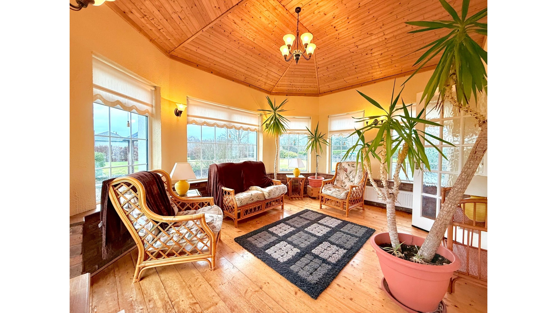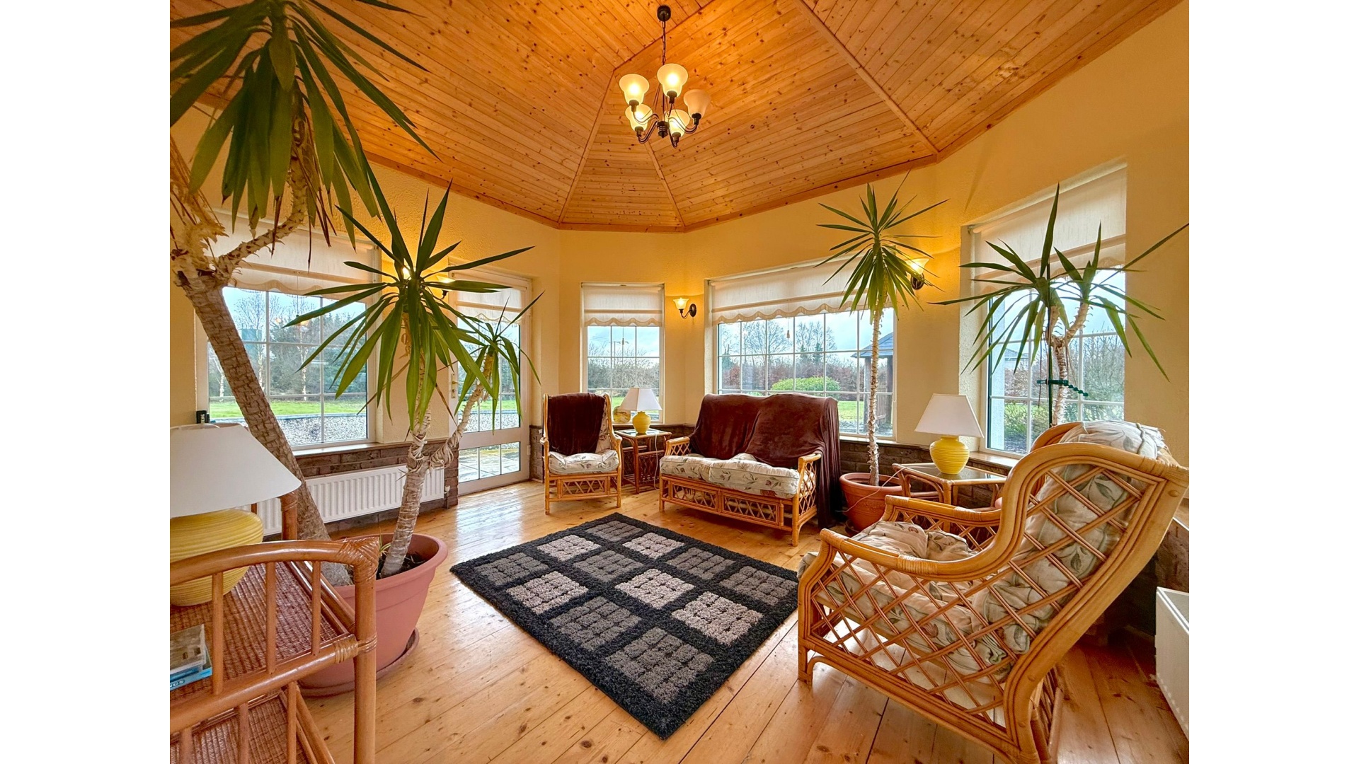 A bright conservatory extends from the main living space, flooding the home with natural light and offering a peaceful spot to relax while enjoying views of the surrounding gardens.