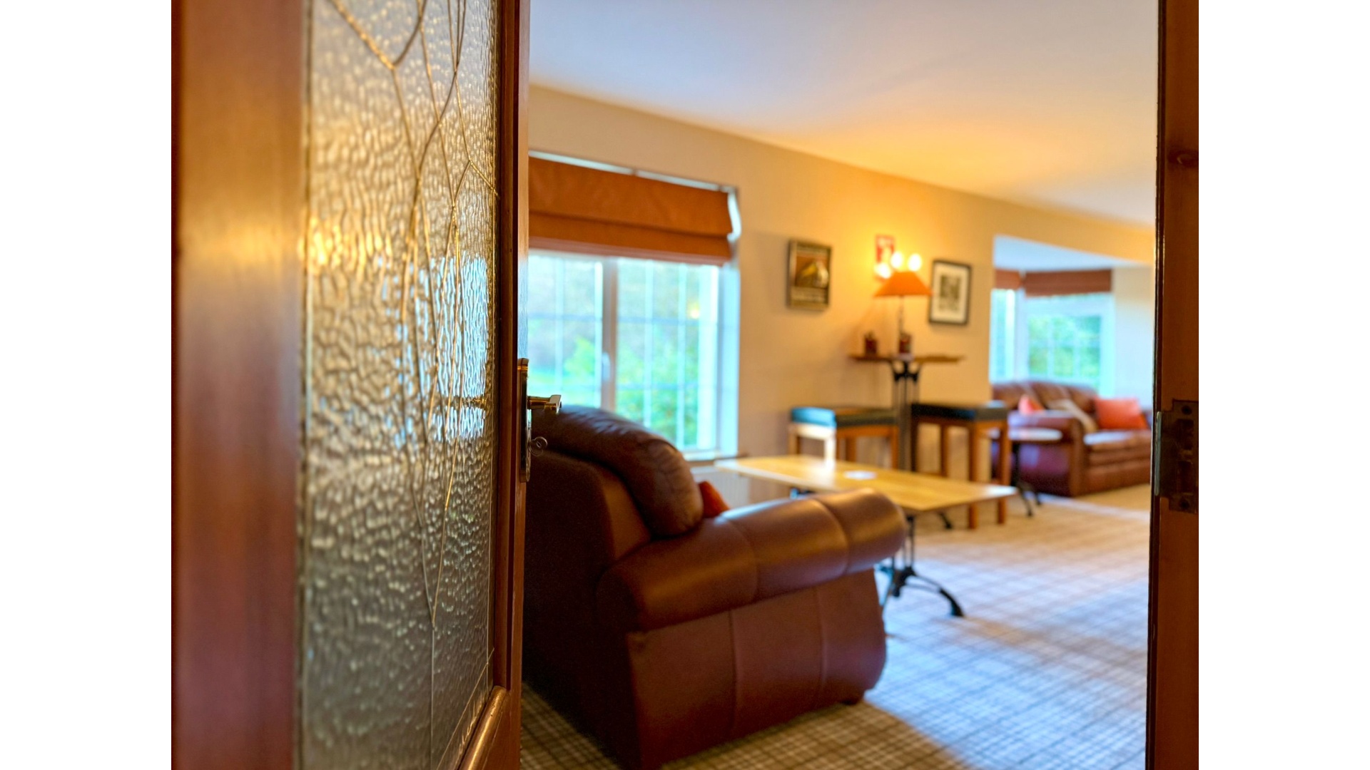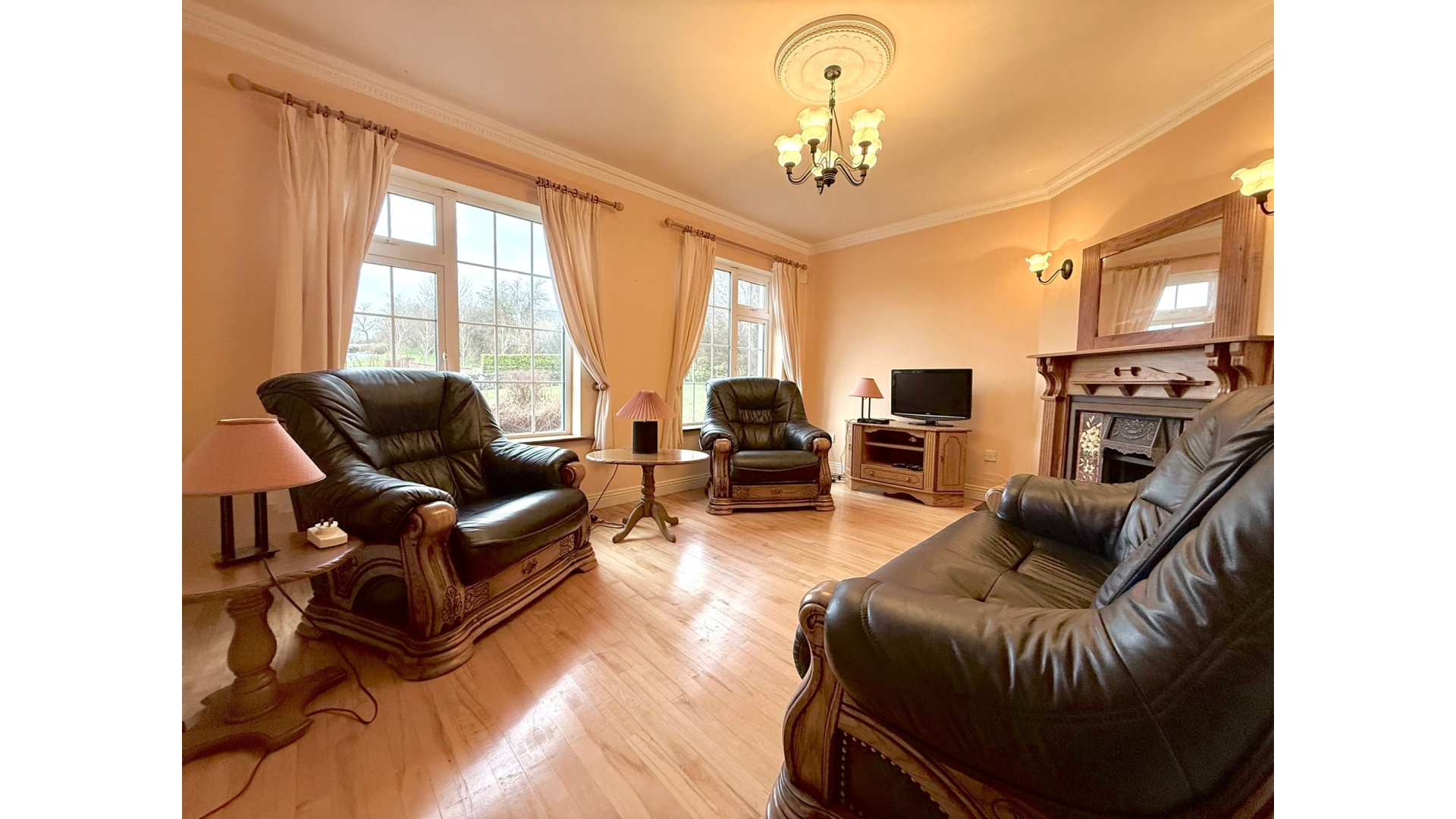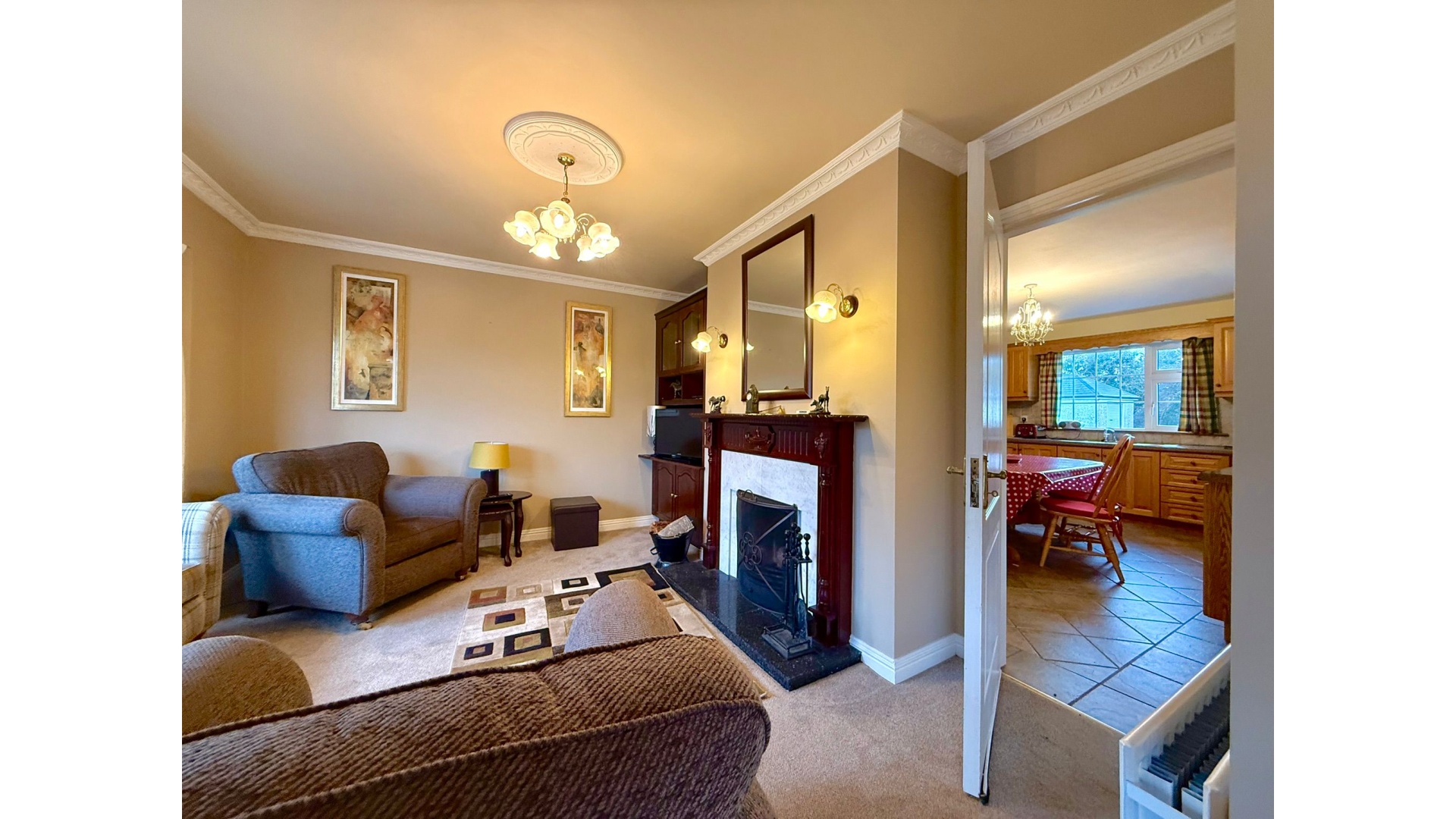 The main sitting room, complete with an open fire, provides a cosy yet spacious retreat — ideal for winter evenings.