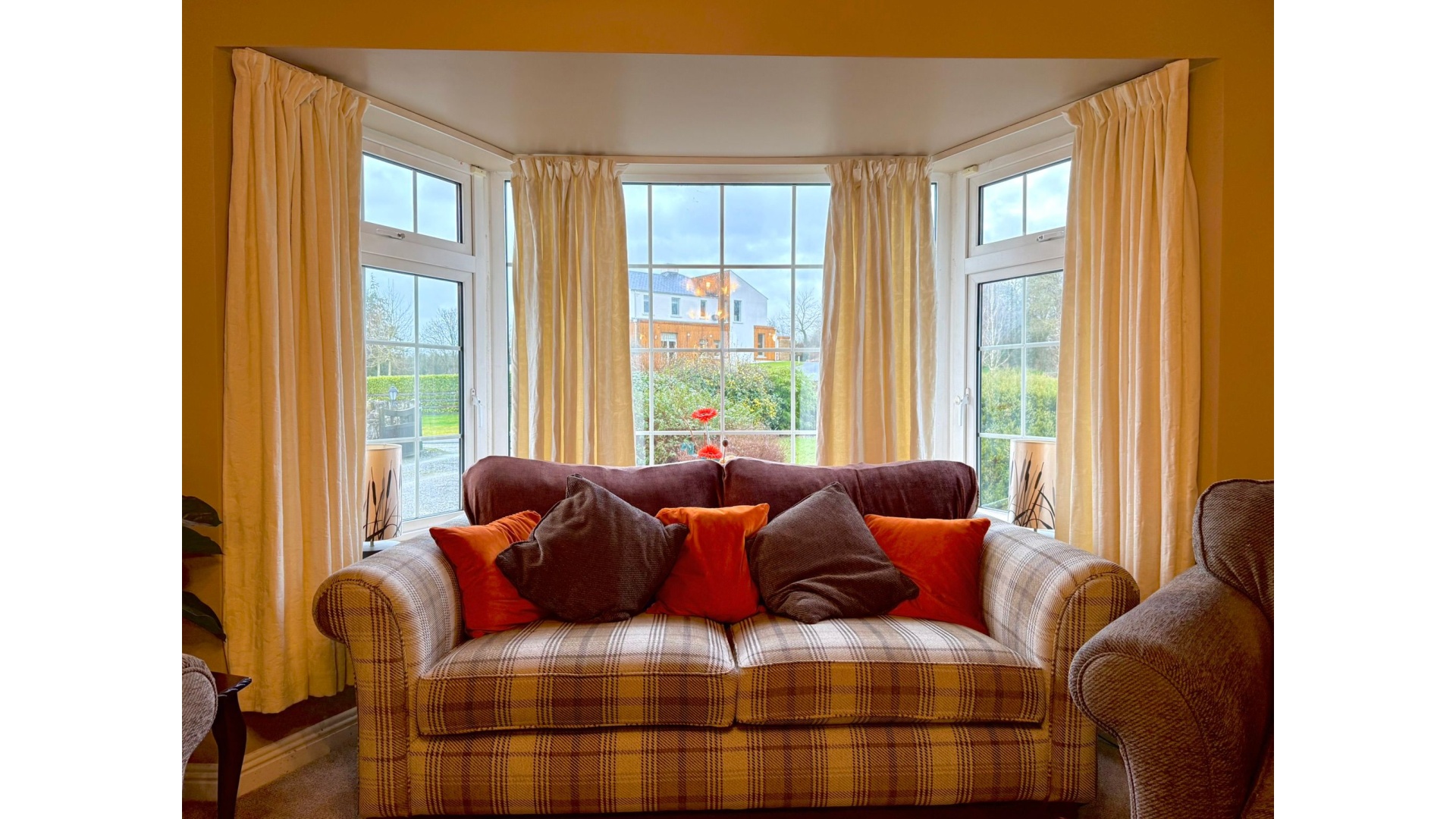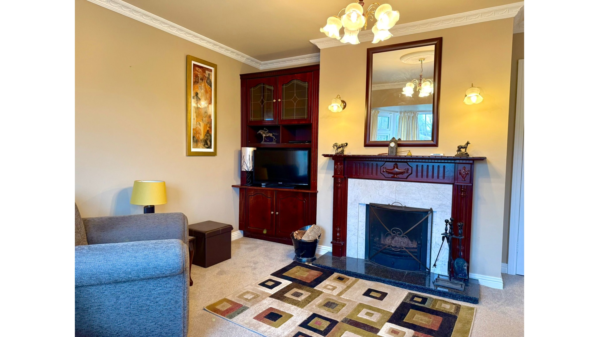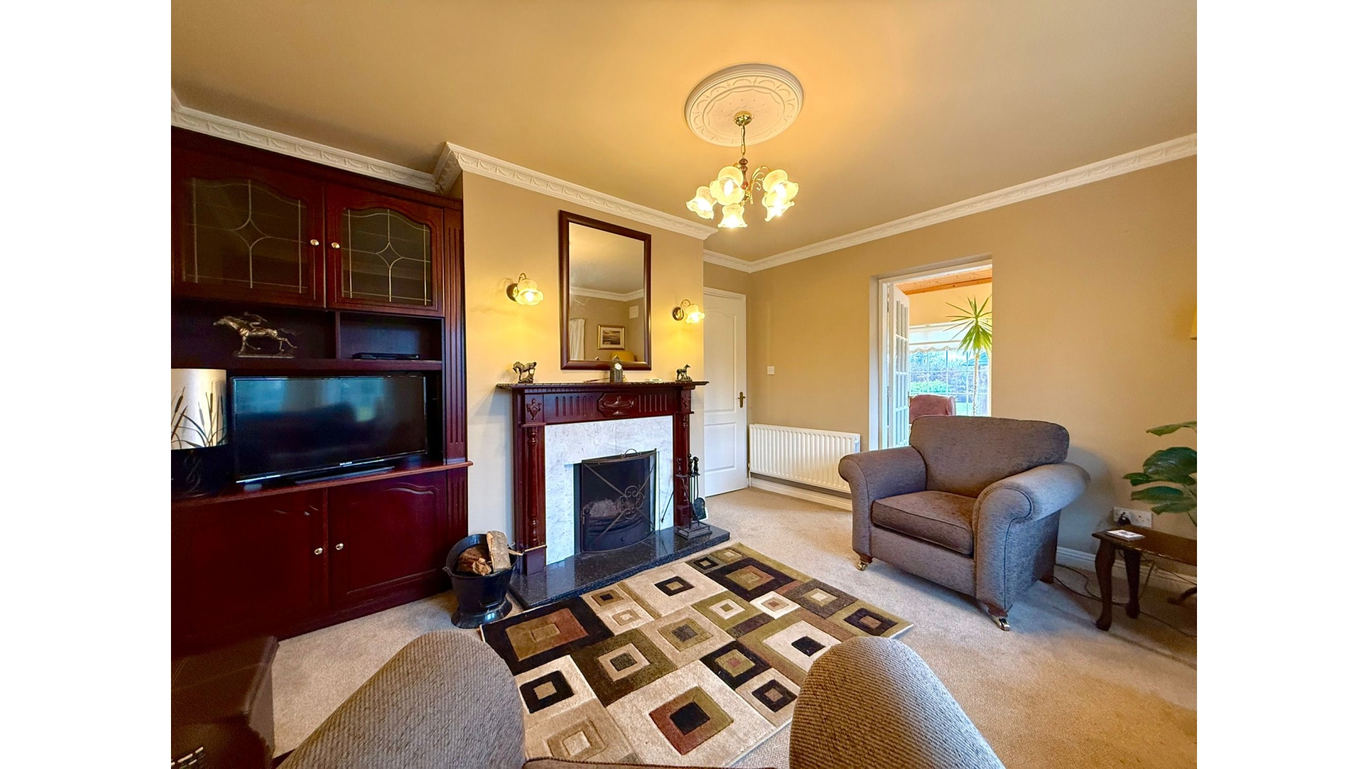 The main sitting room, complete with an open fire, provides a cosy yet spacious retreat — ideal for winter evenings.