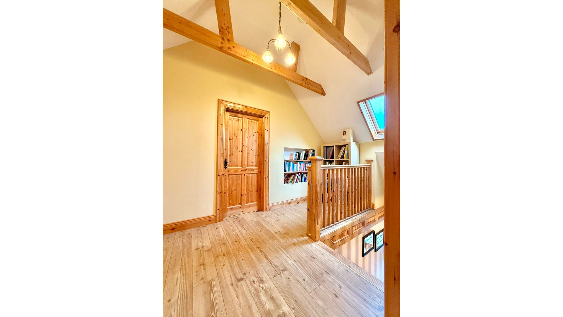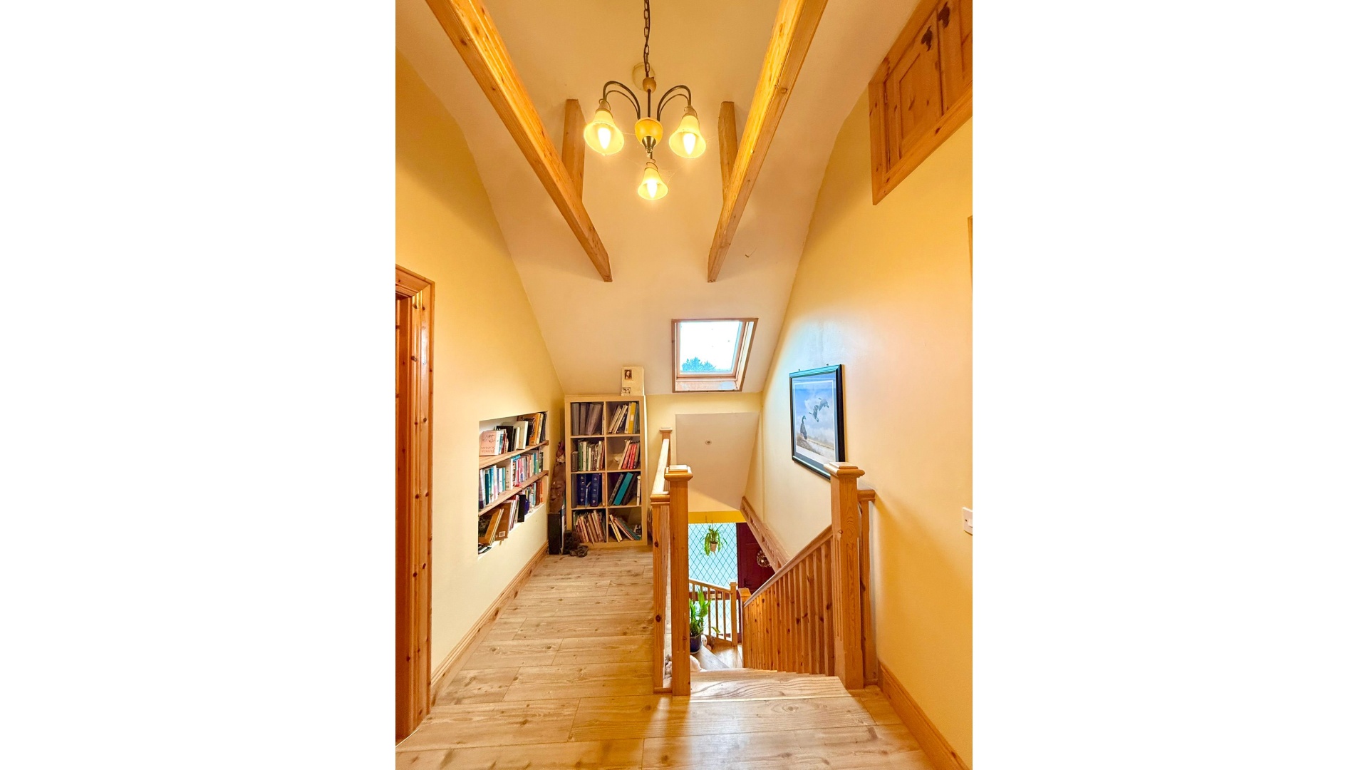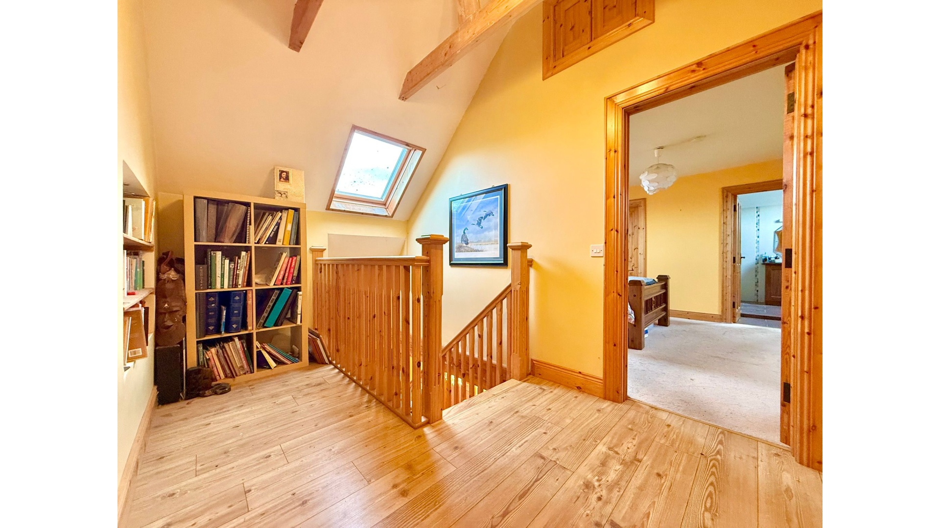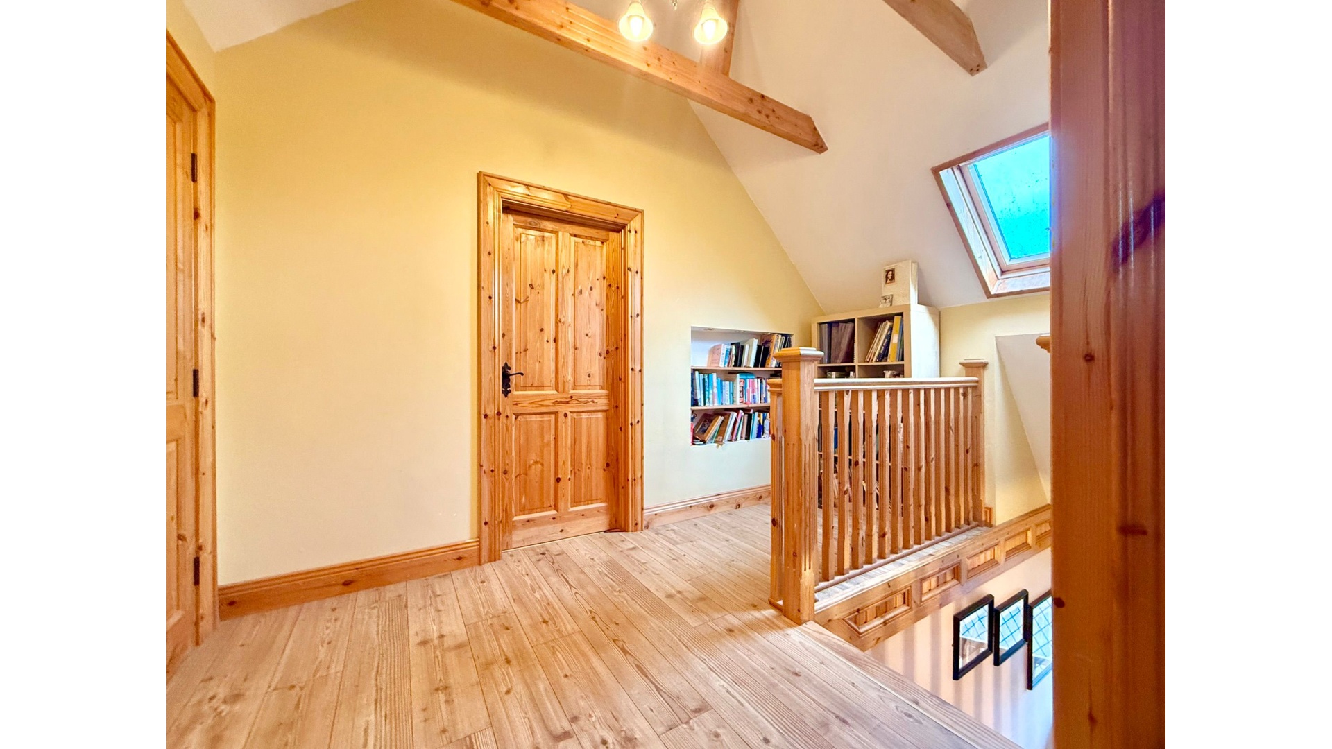 The accommodation comprises five generous bedrooms with solid wood flooring, three of which are ensuite, along with a well-appointed family bathroom. Additional features such as upstairs laundry storage and a built-in reading area with bookcase add further practicality and character.
