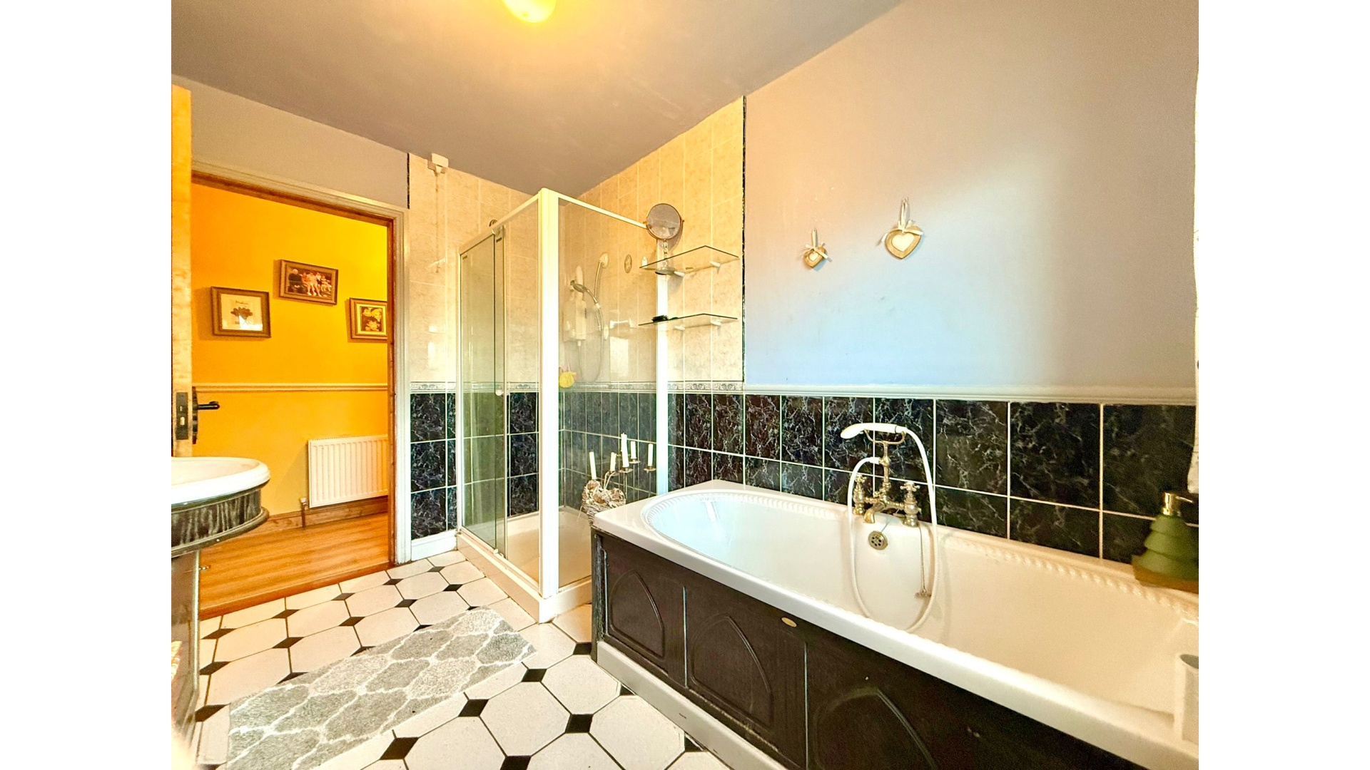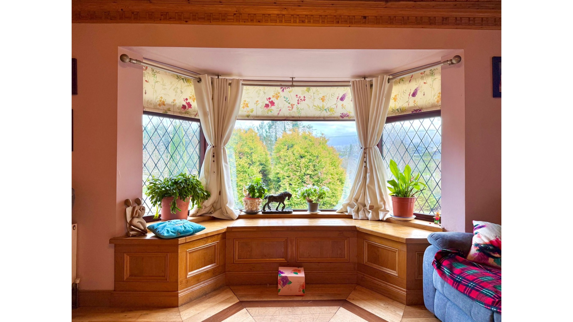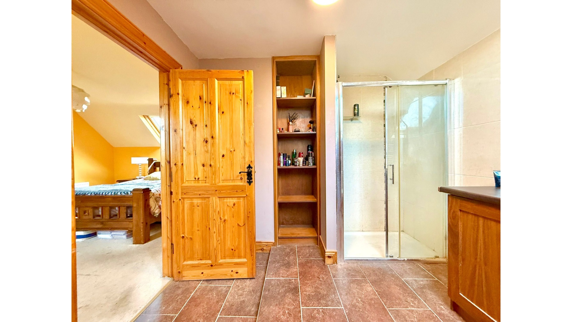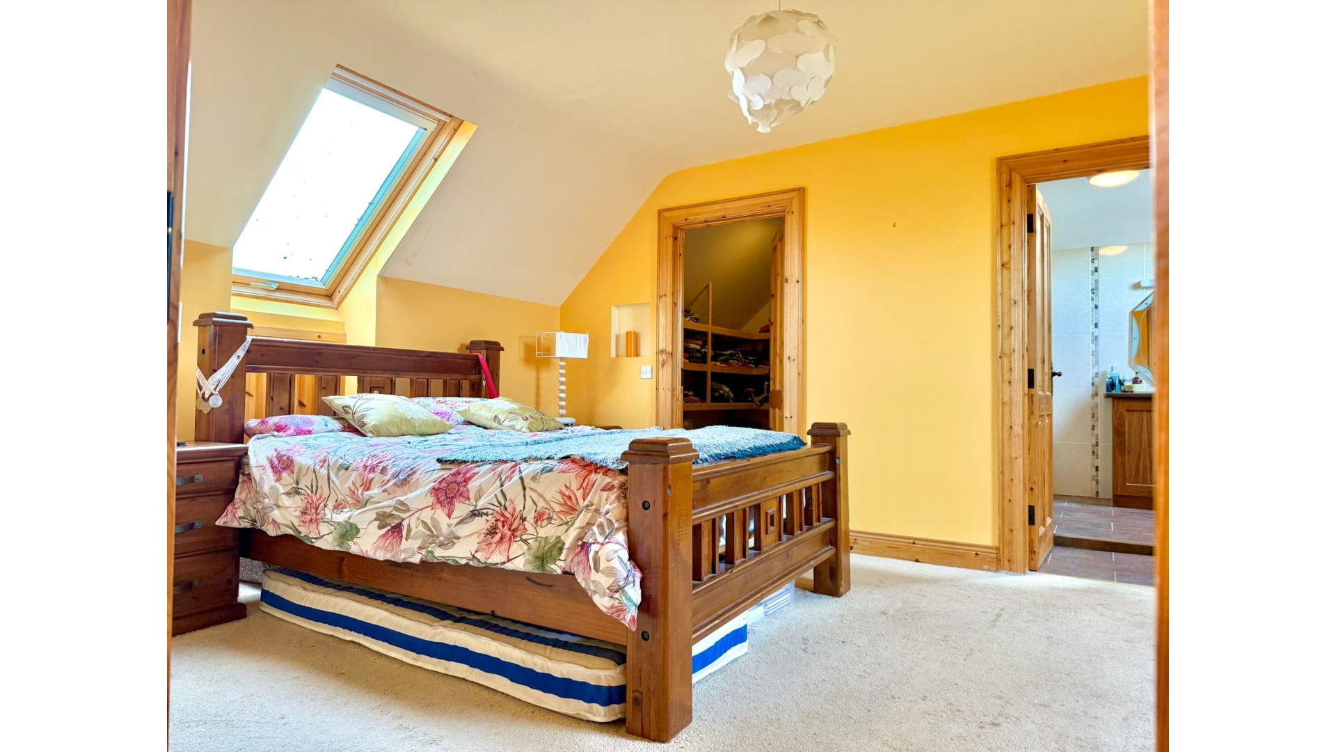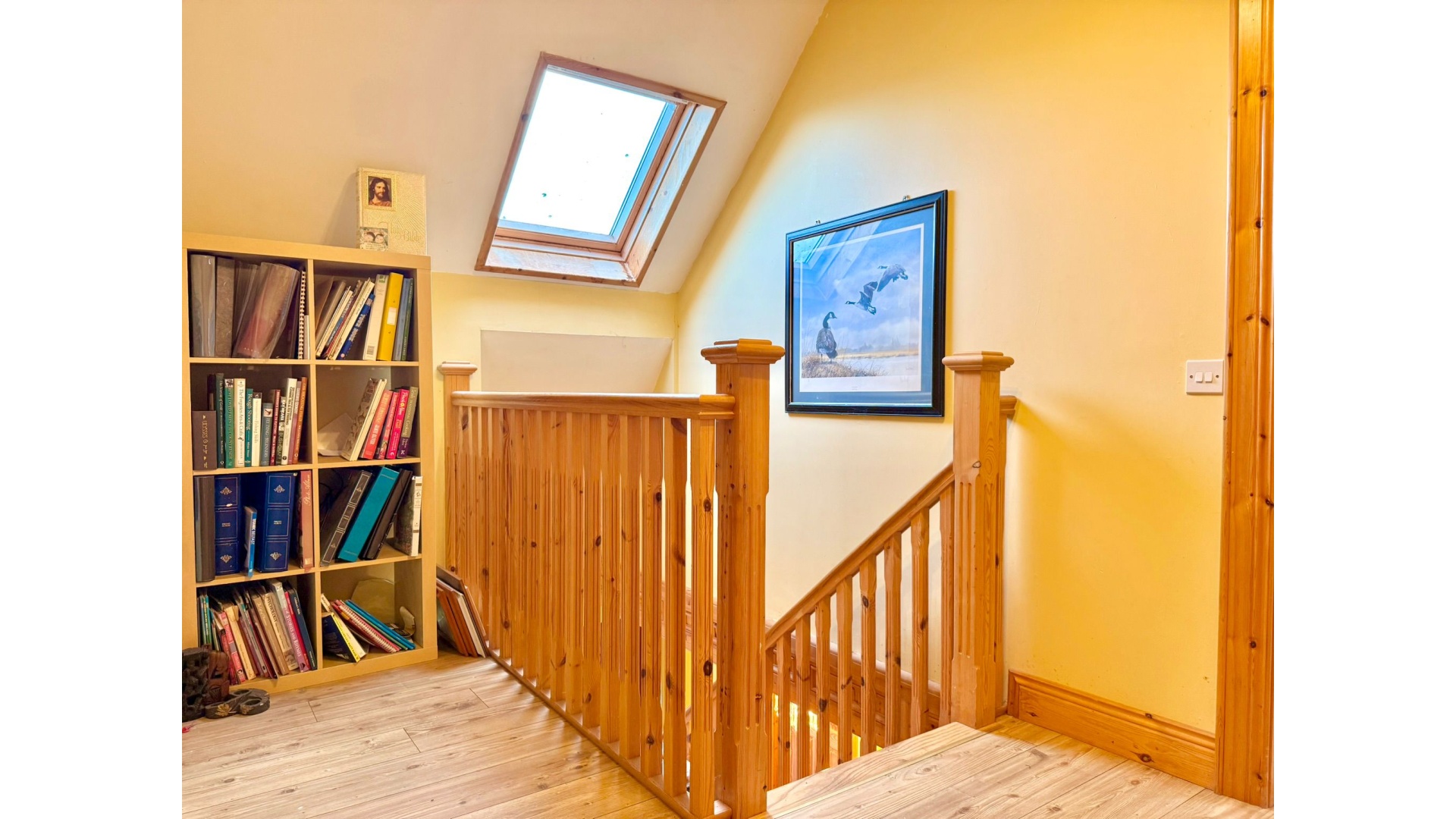 The accommodation comprises five generous bedrooms with solid wood flooring, three of which are ensuite, along with a well-appointed family bathroom. Additional features such as upstairs laundry storage and a built-in reading area with bookcase add further practicality and character.
