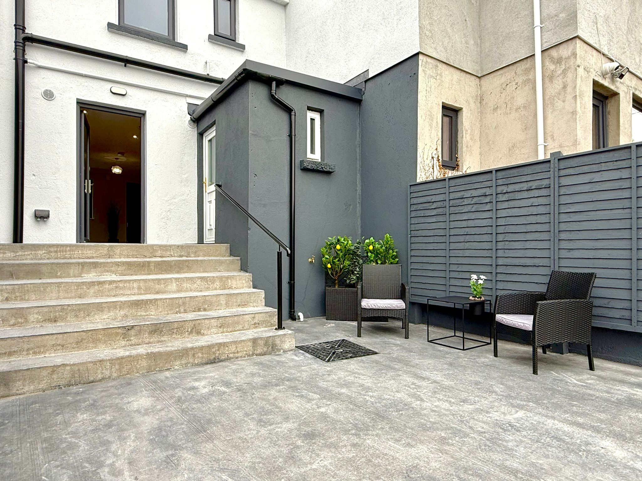 To the rear, the property enjoys a private enclosed garden, complete with patio area and step-down lawn, offering an ideal outdoor space for relaxation or entertaining.