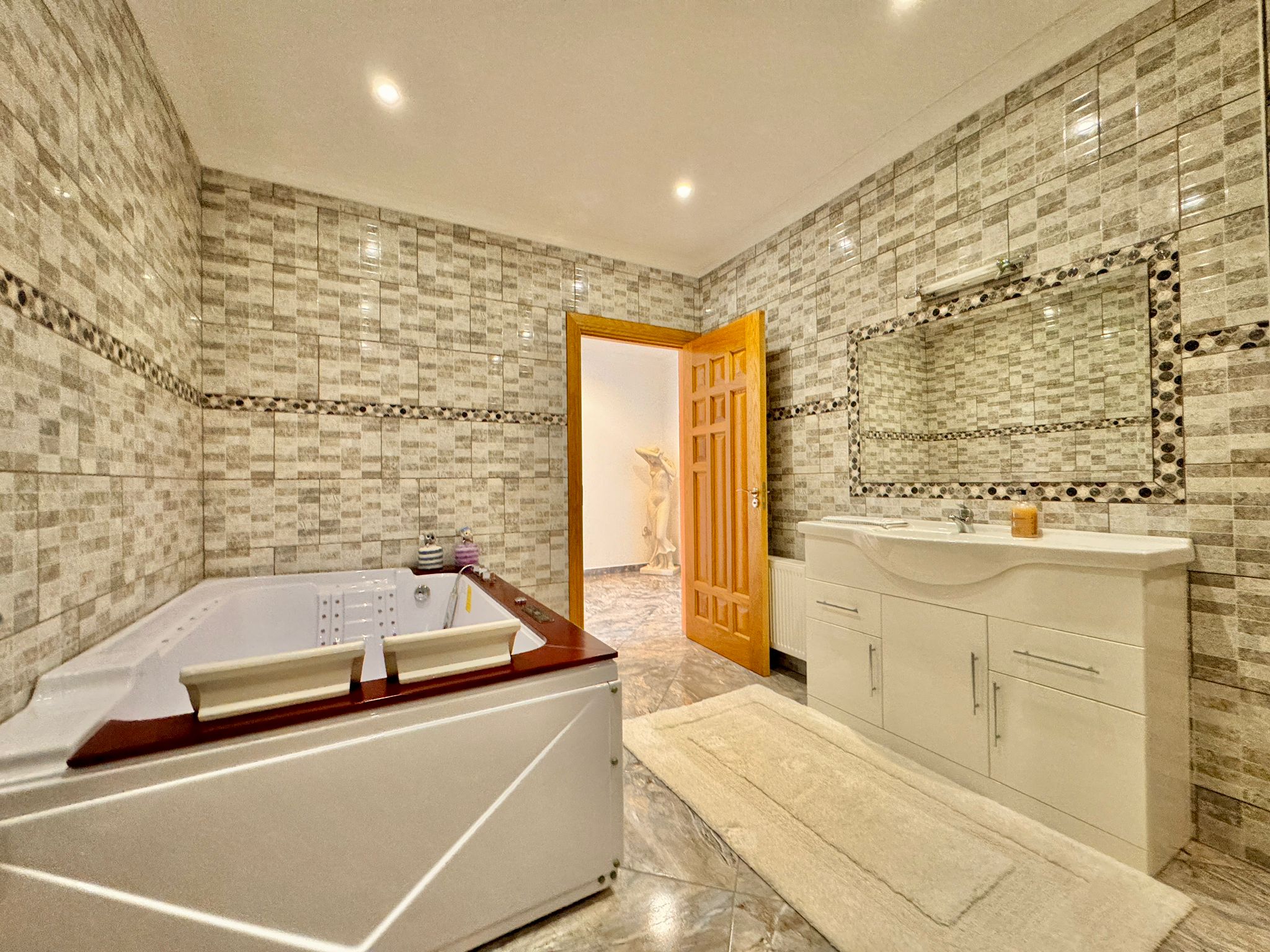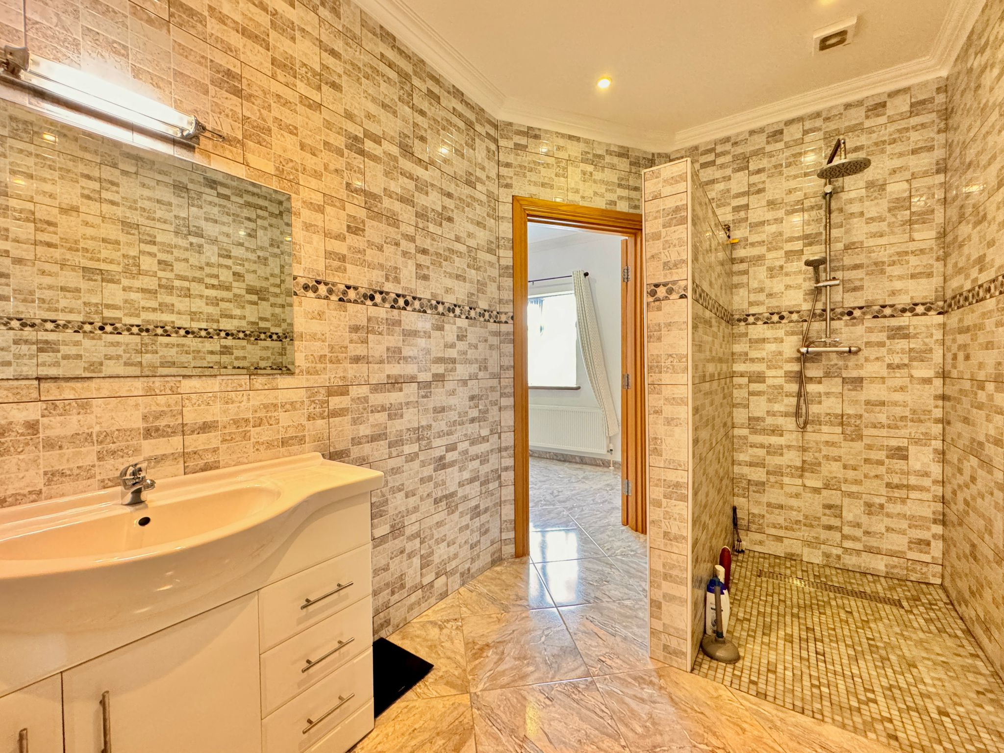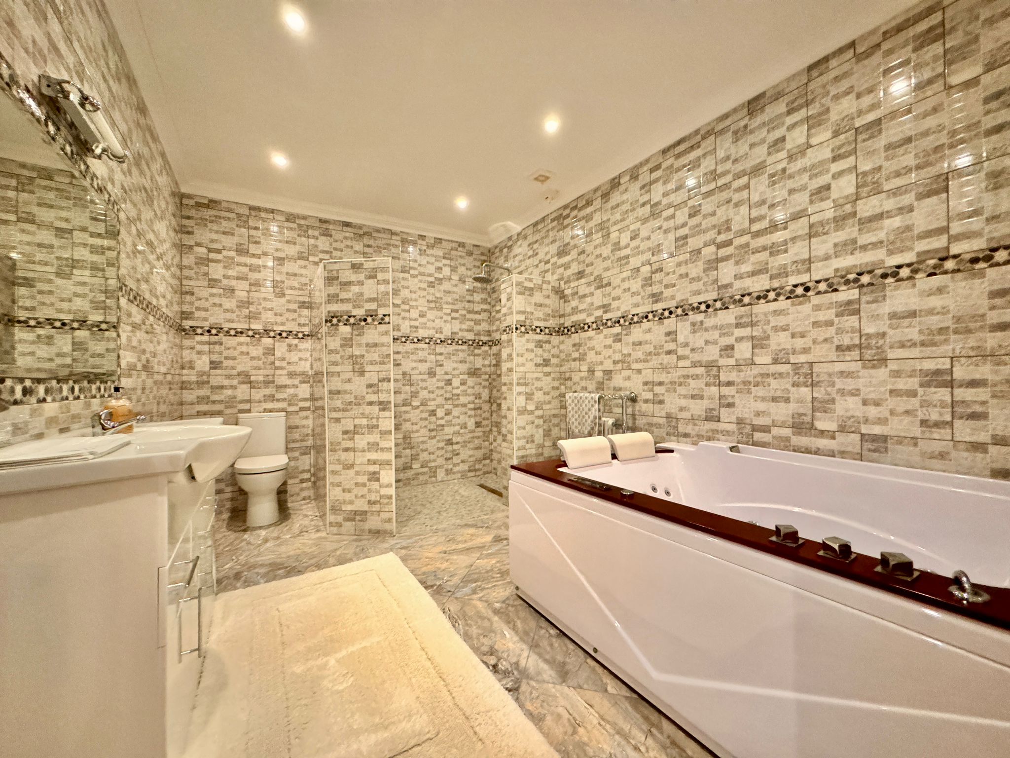 The large modern bathroom boasts an open plan shower area complimented with a large Jacuzzi.