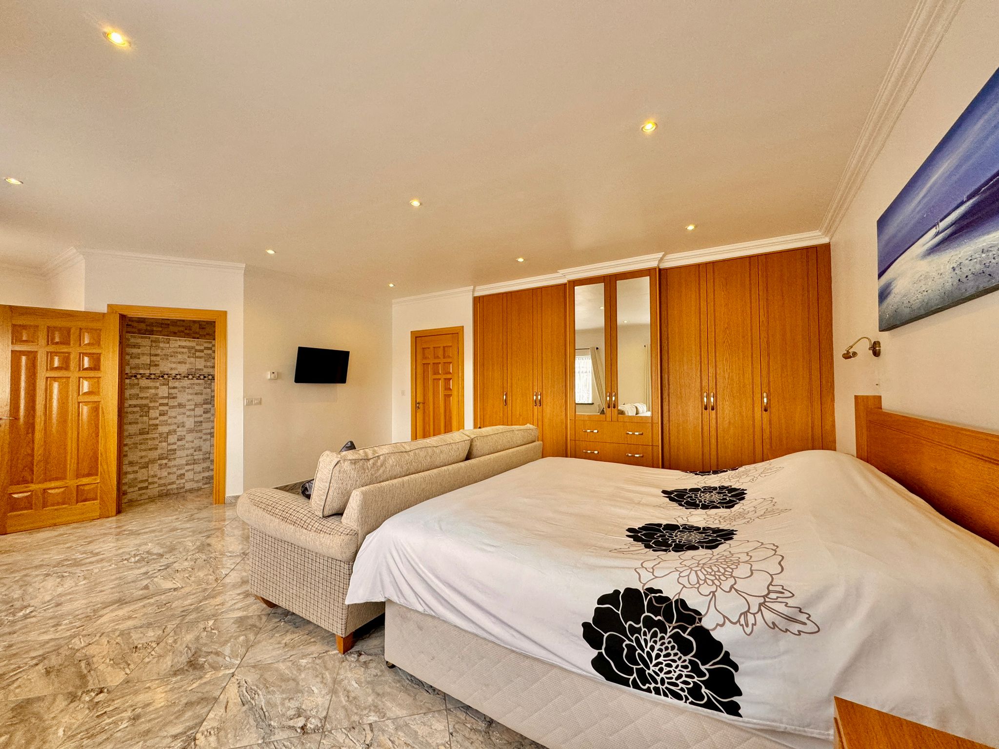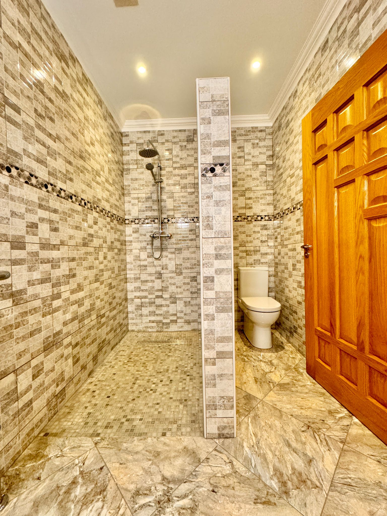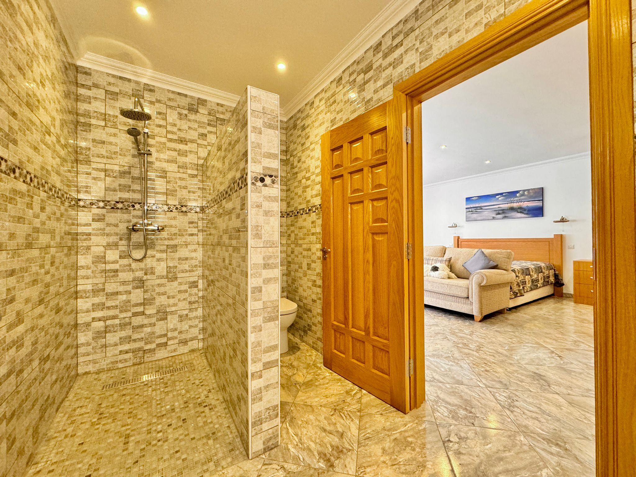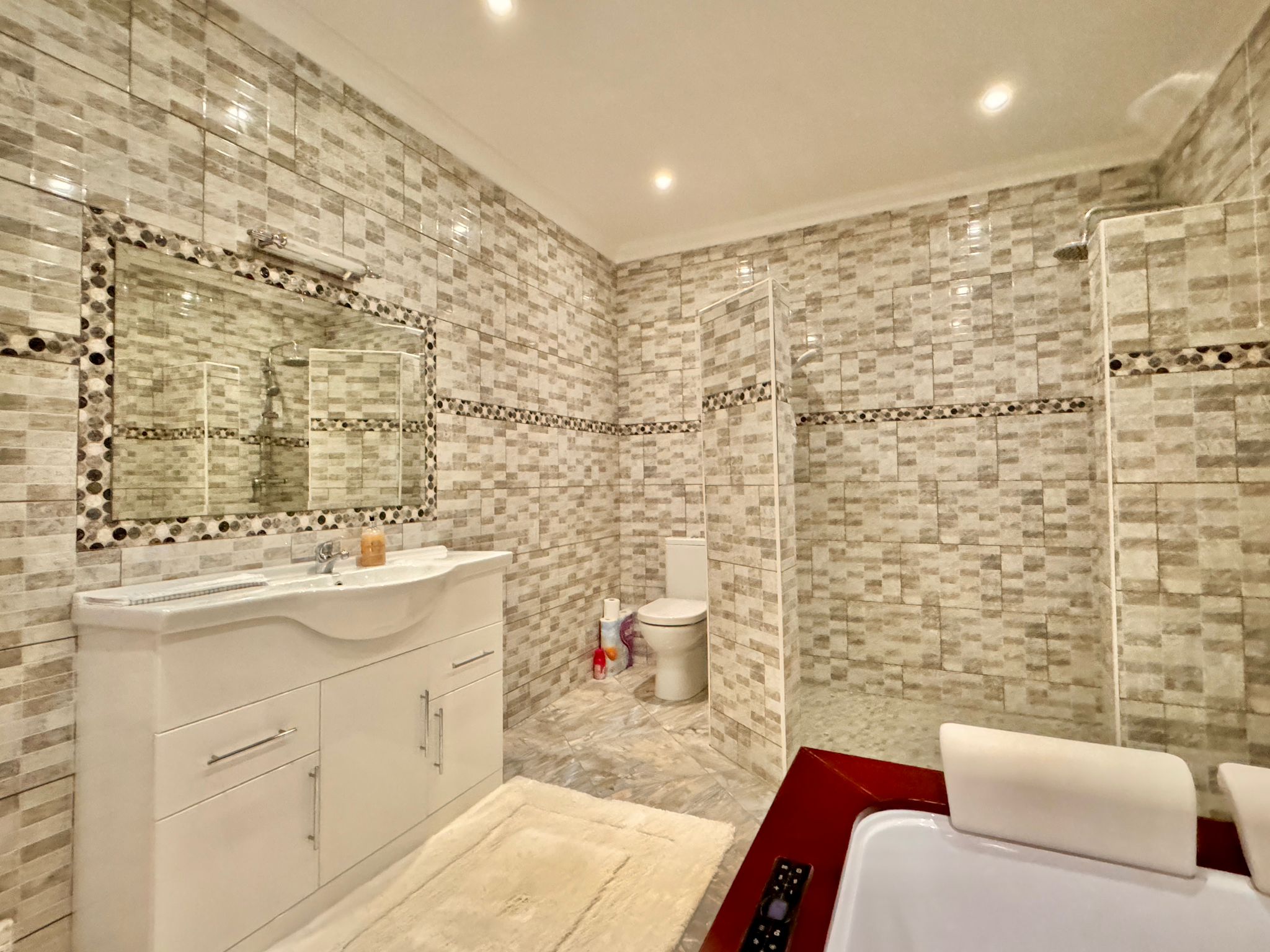 The large modern bathroom boasts an open plan shower area complimented with a large Jacuzzi.