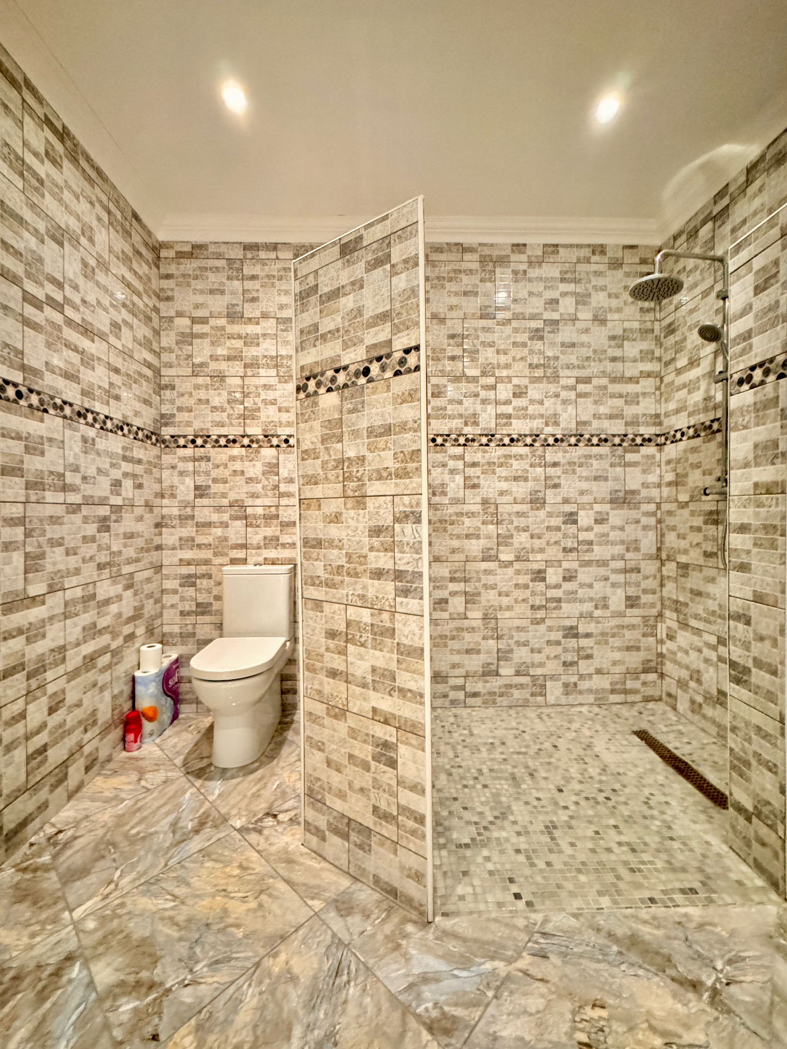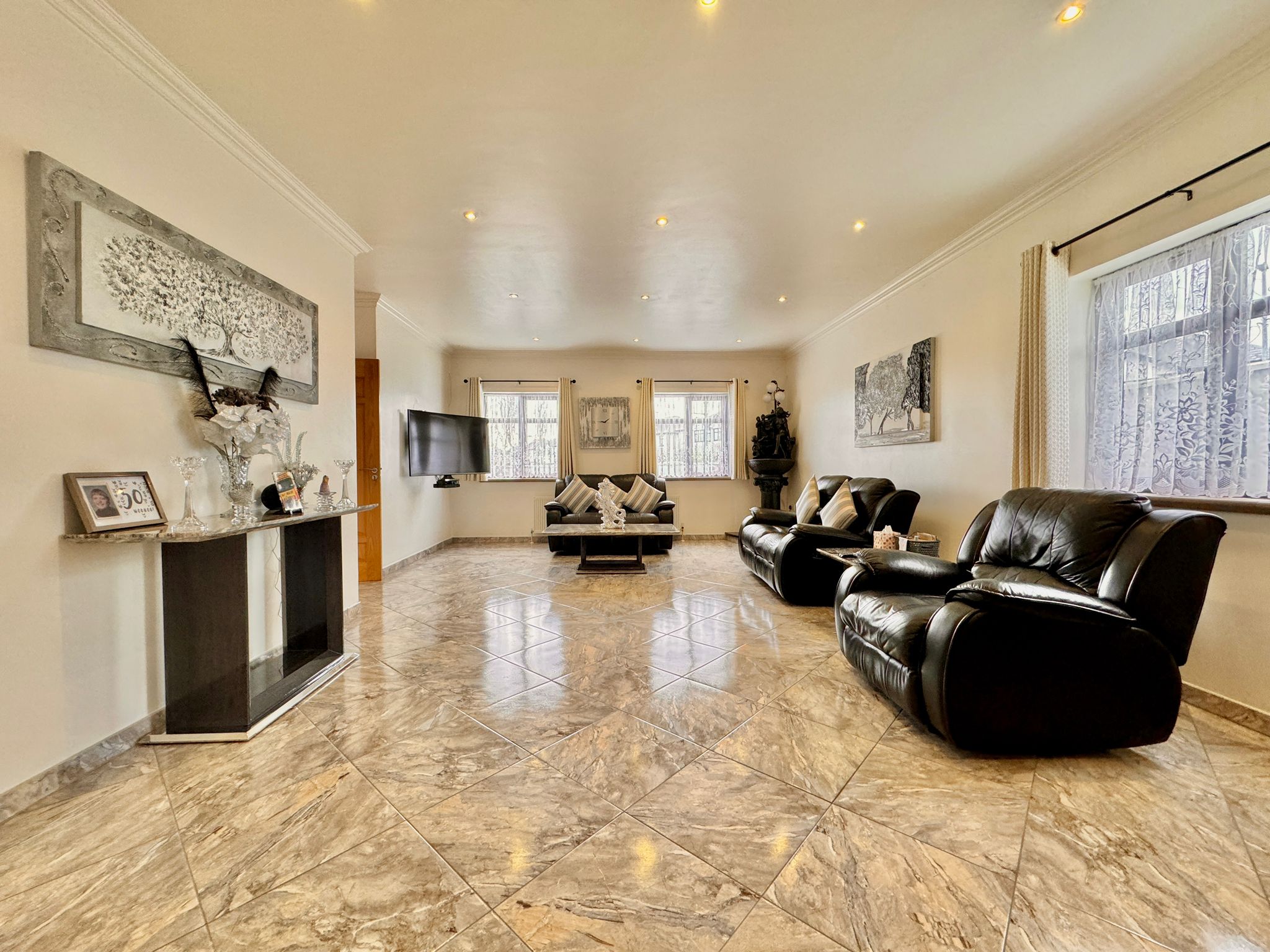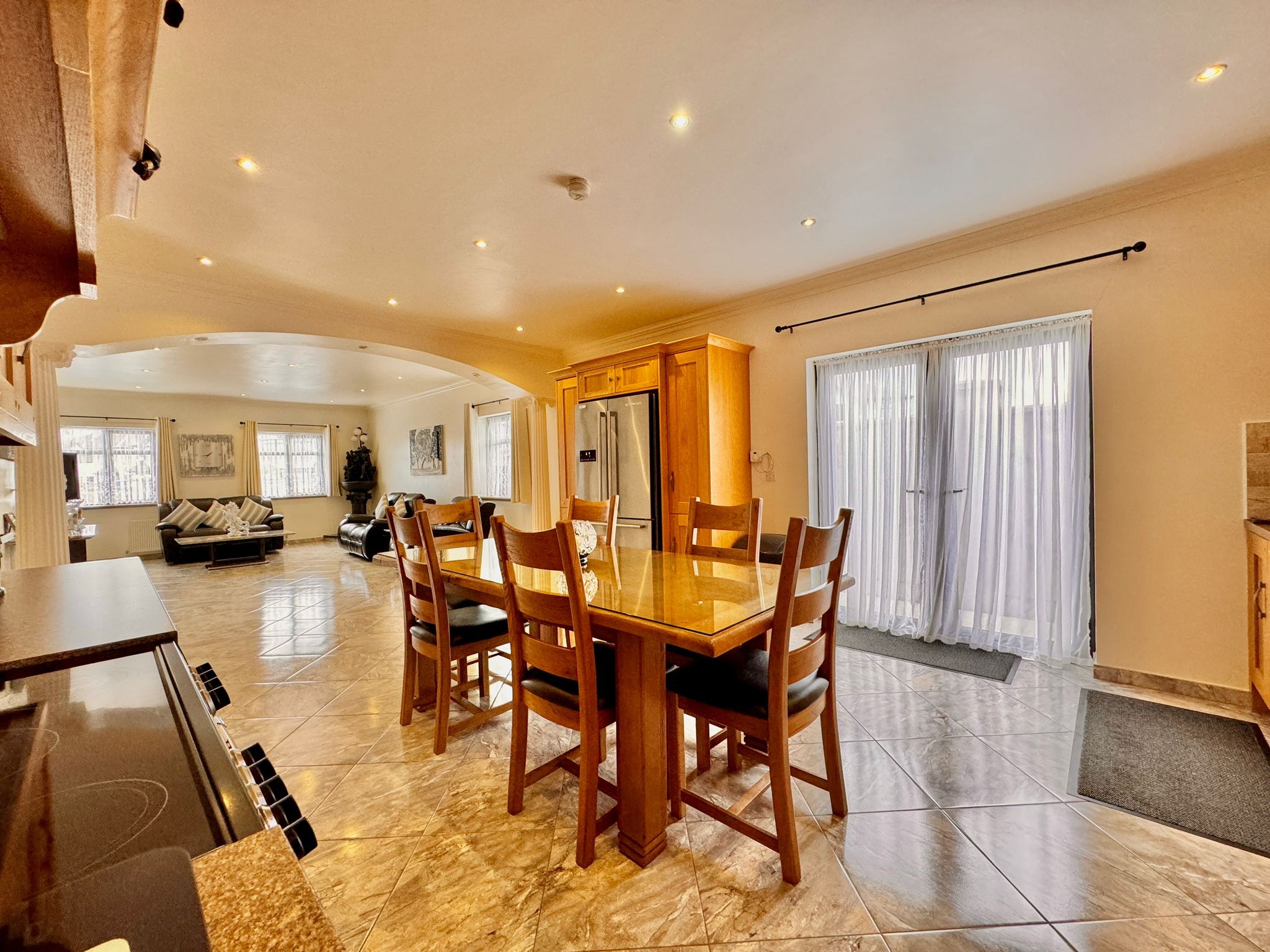 Upon entering the bungalow, a welcoming, tiled foyer leads you into the heart of the home. The open-plan design seamlessly connects the kitchen where one will find an open plan kitchen, dining area, and spacious sitting room, creating a perfect space for family gatherings and entertaining. The sitting room boasts a cosy atmosphere with beautiful tiled flooring. This area provides warmth on cooler evenings while offering a focal point for relaxation.